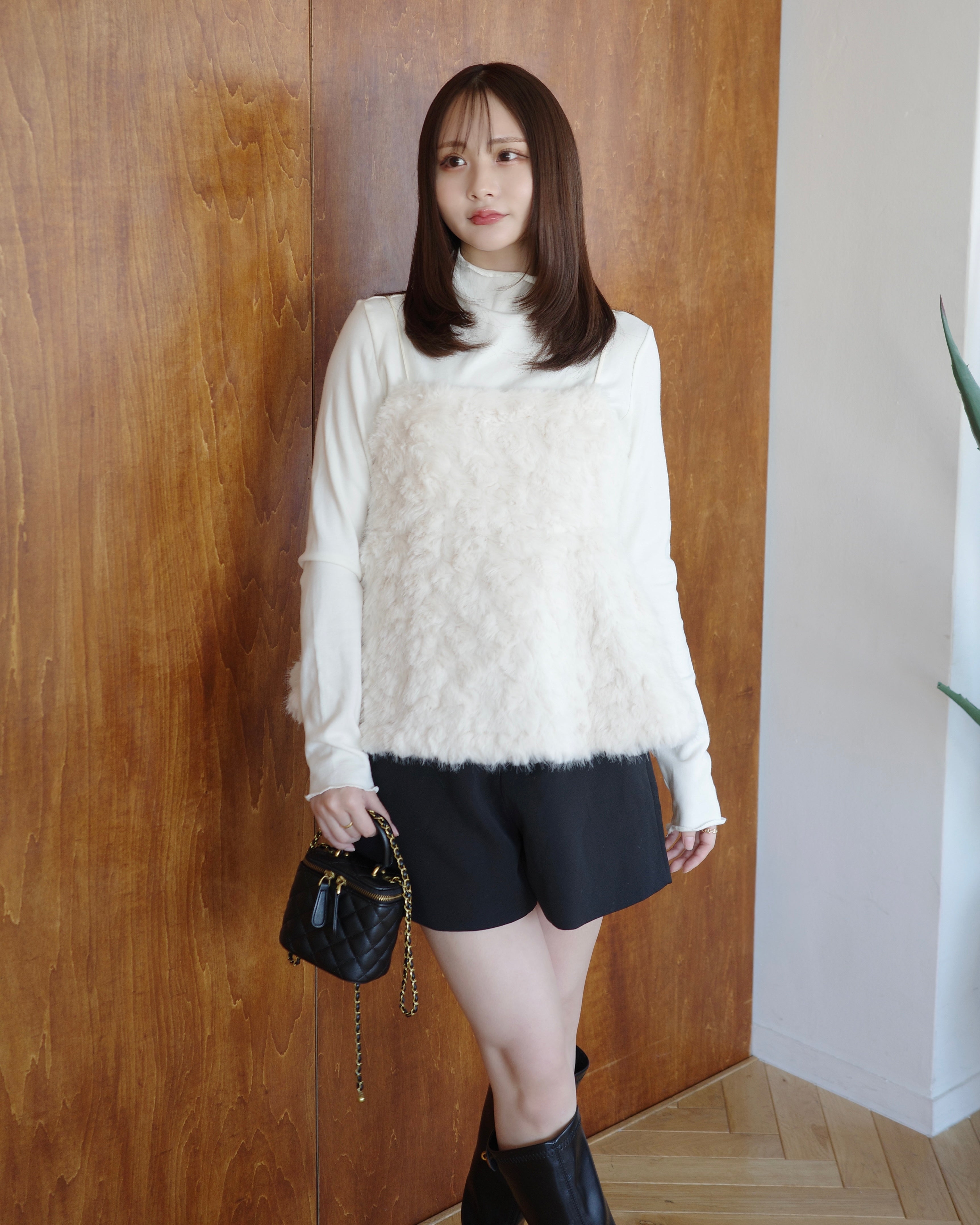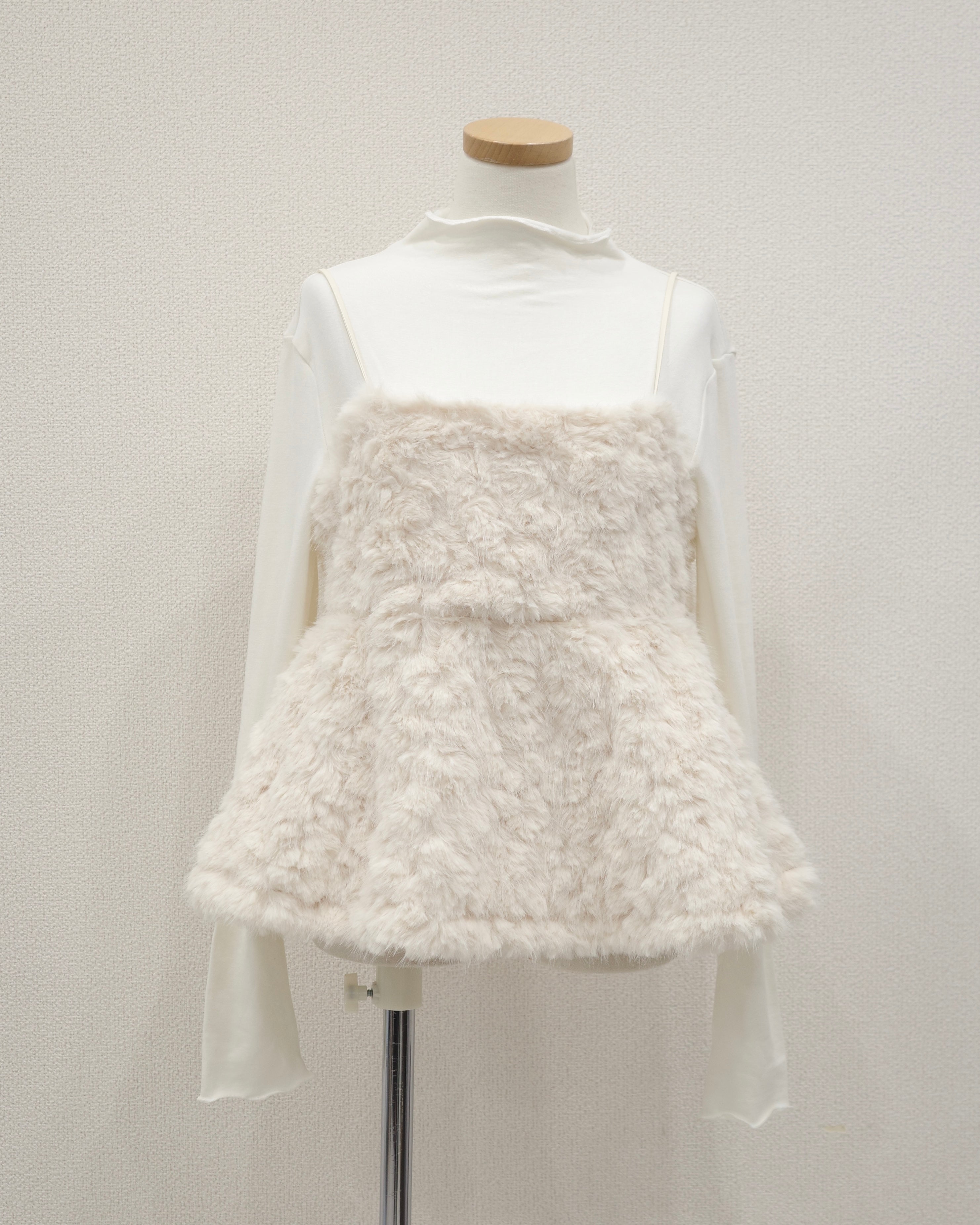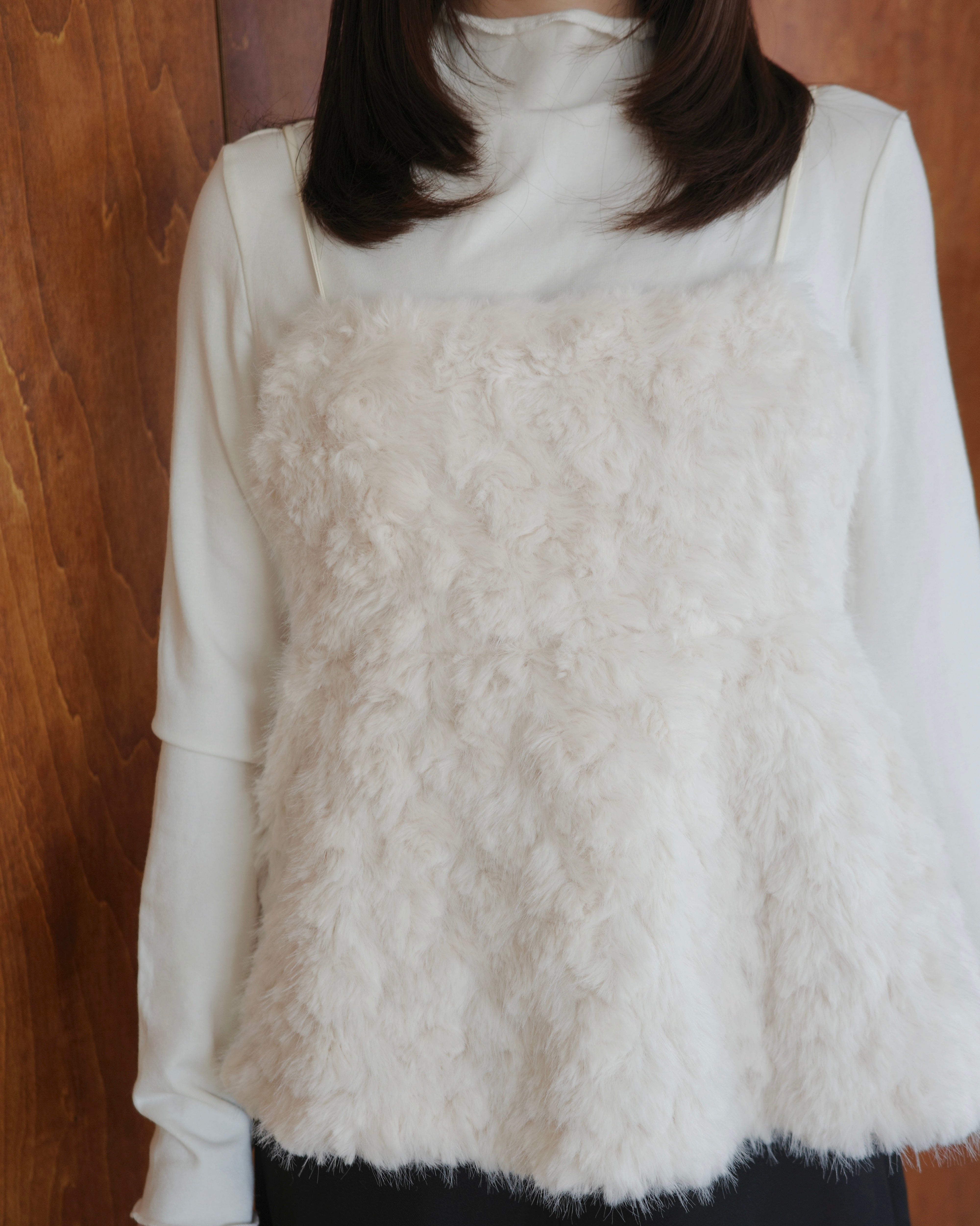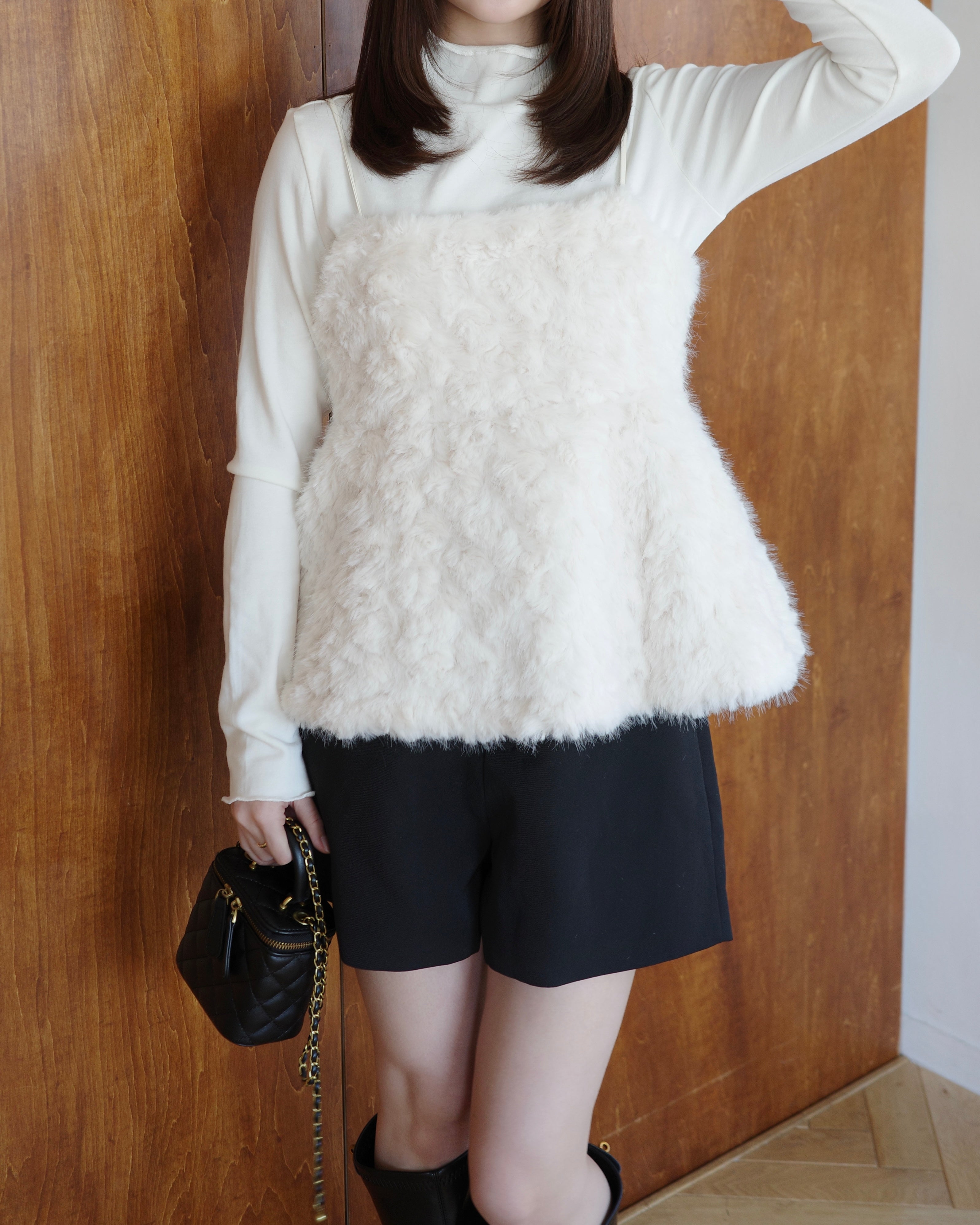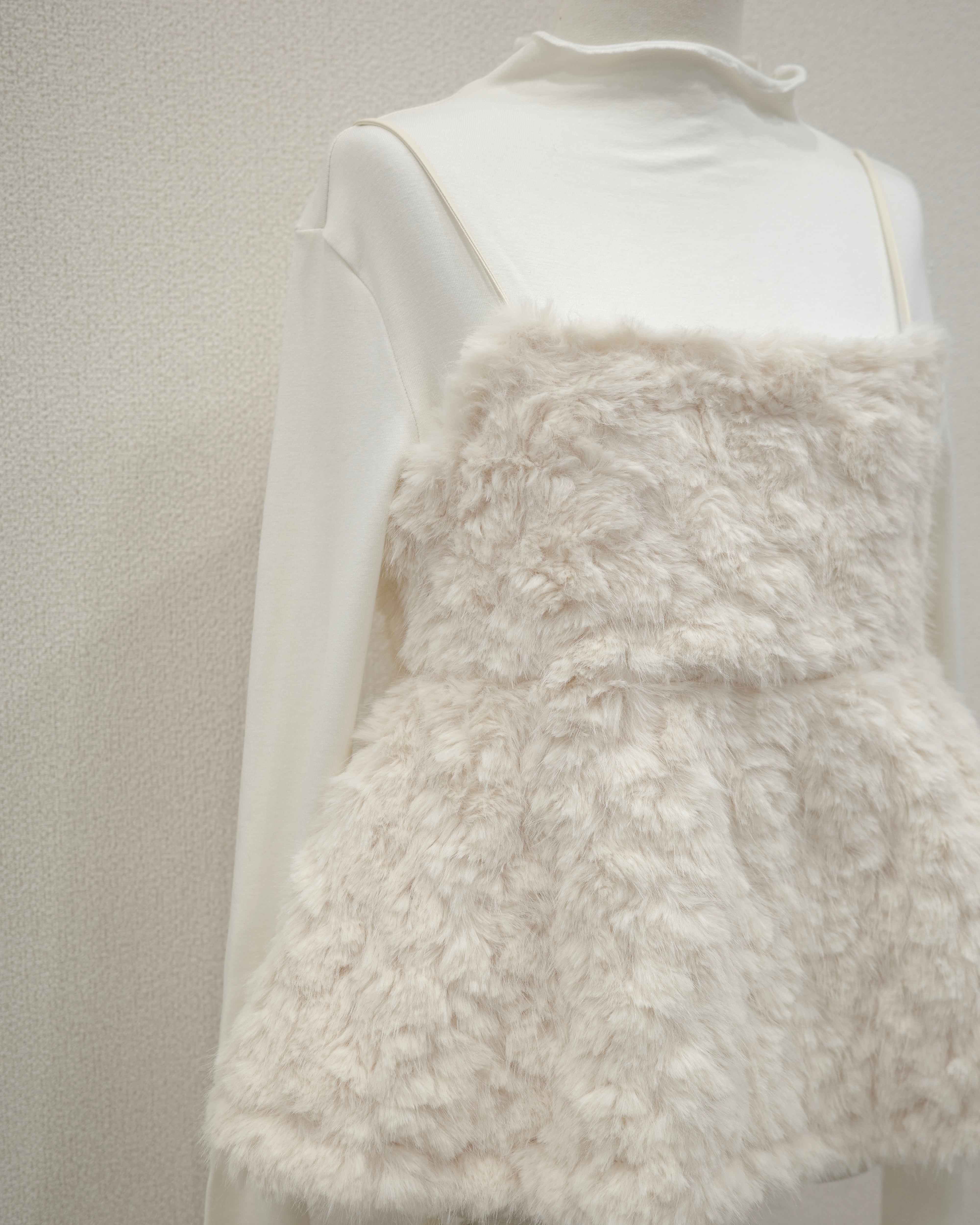 柔らかな肌触りが癖になるフェイクファー素材のビスチェがポイント。