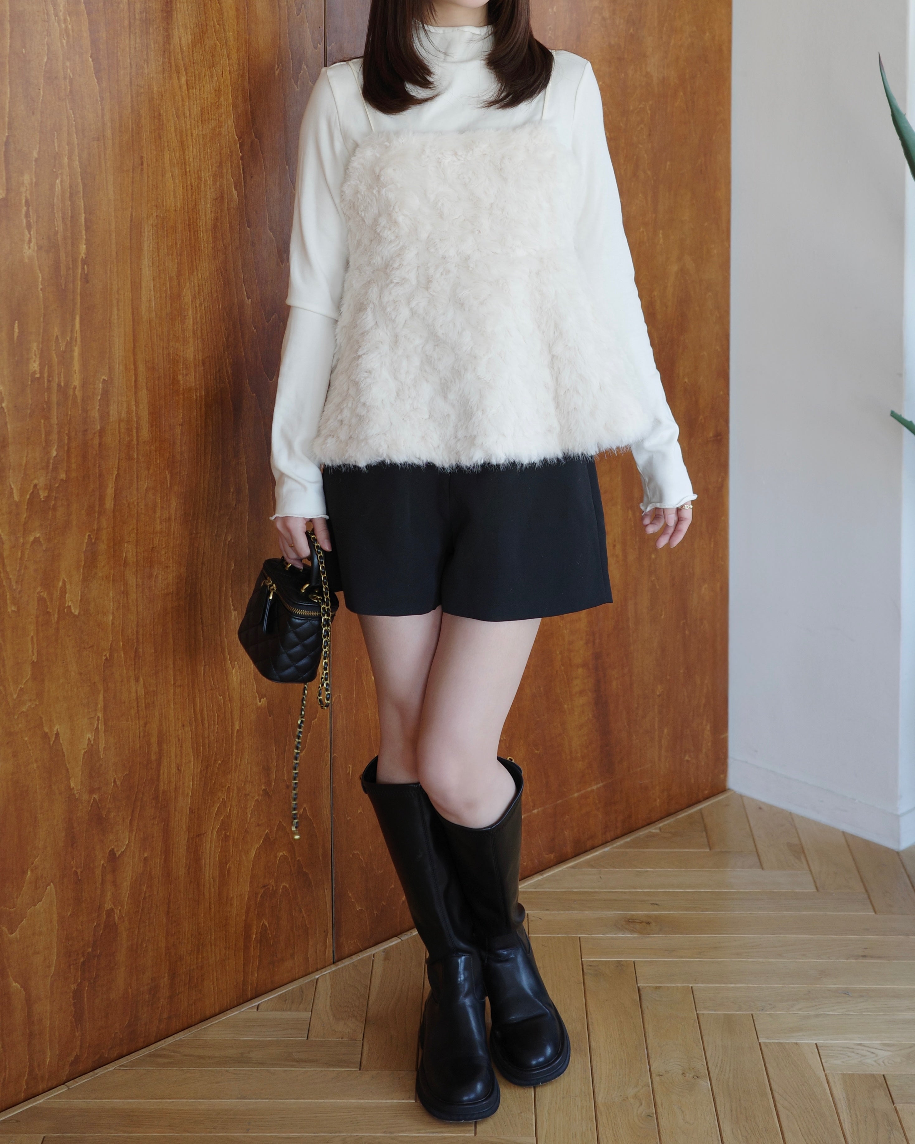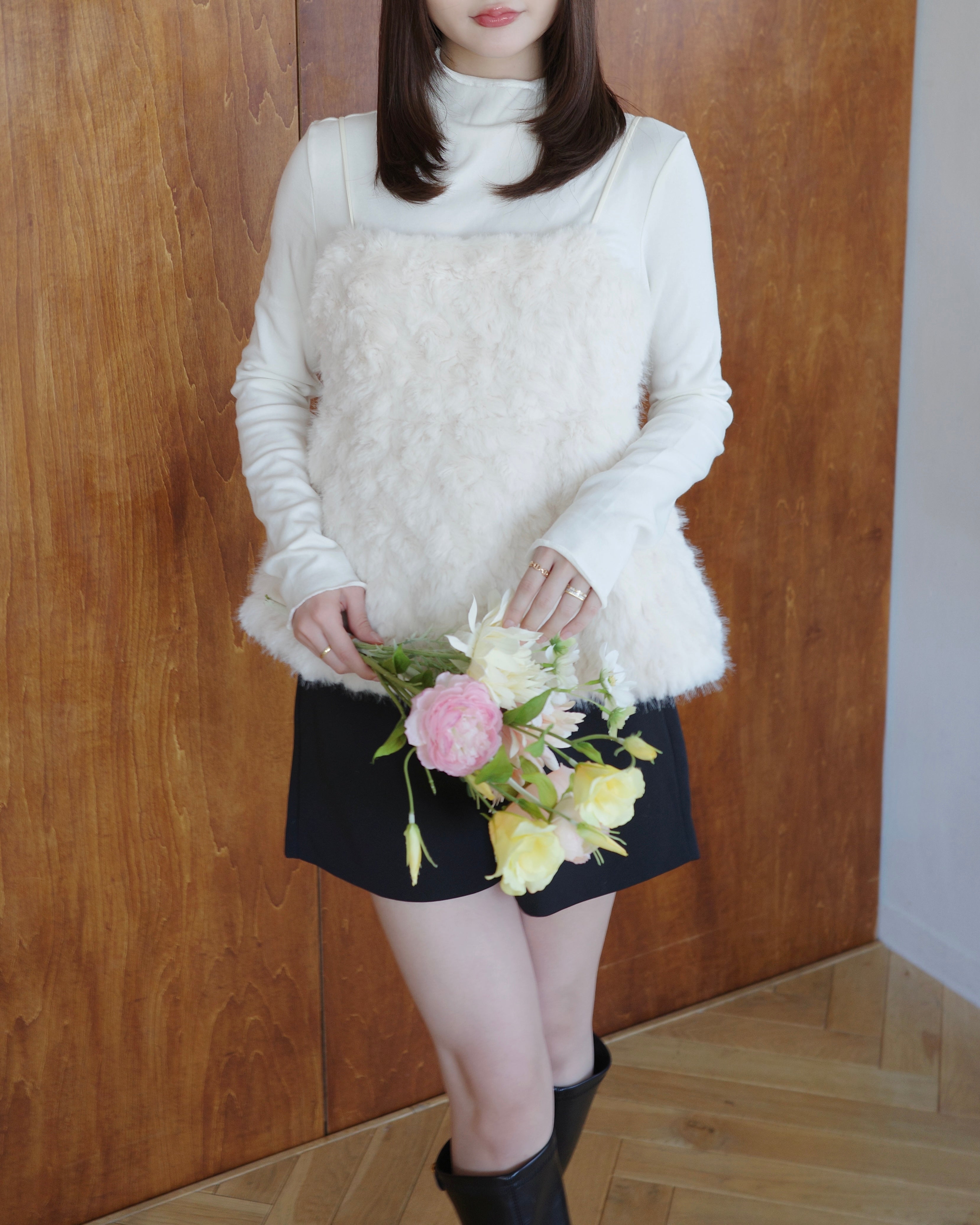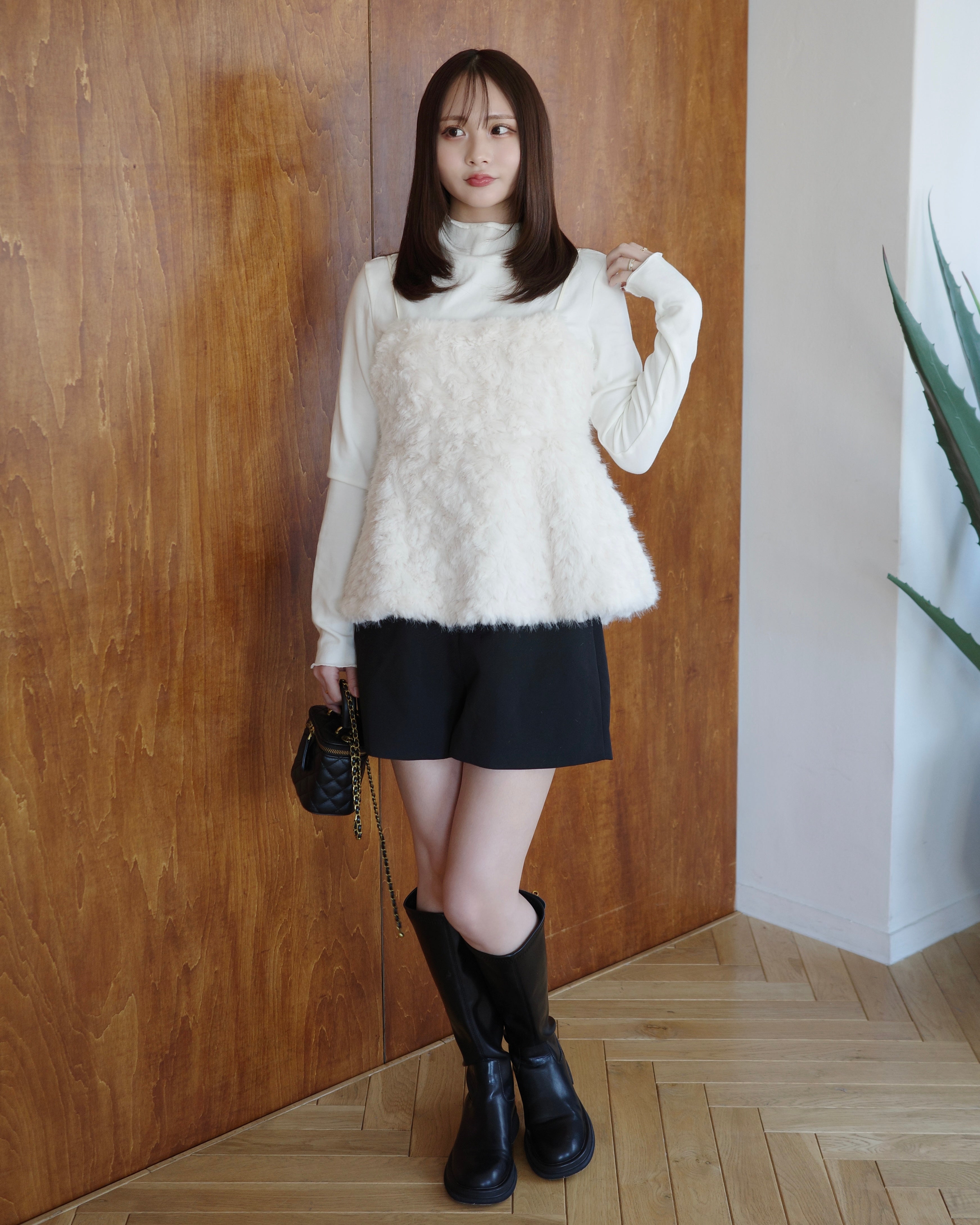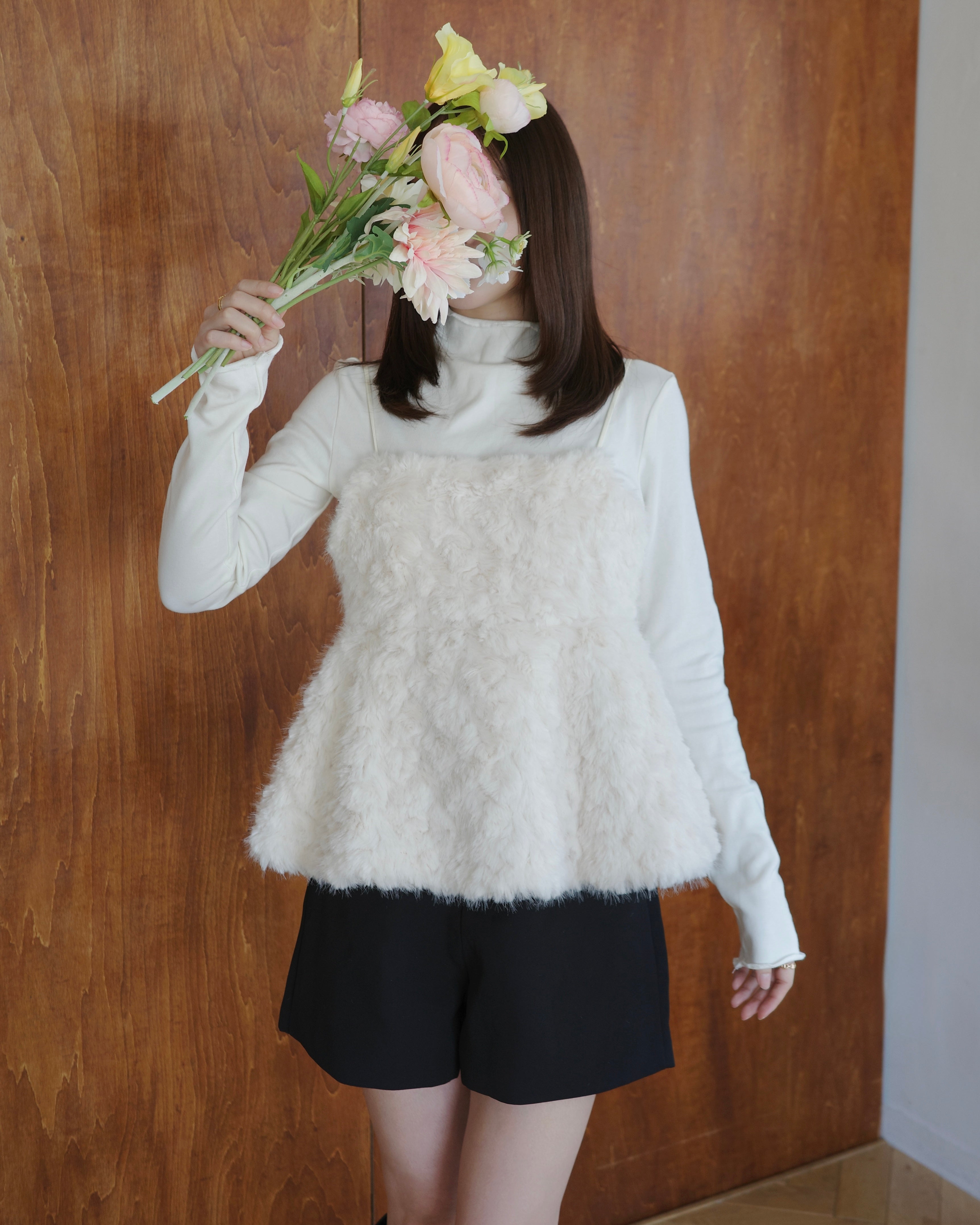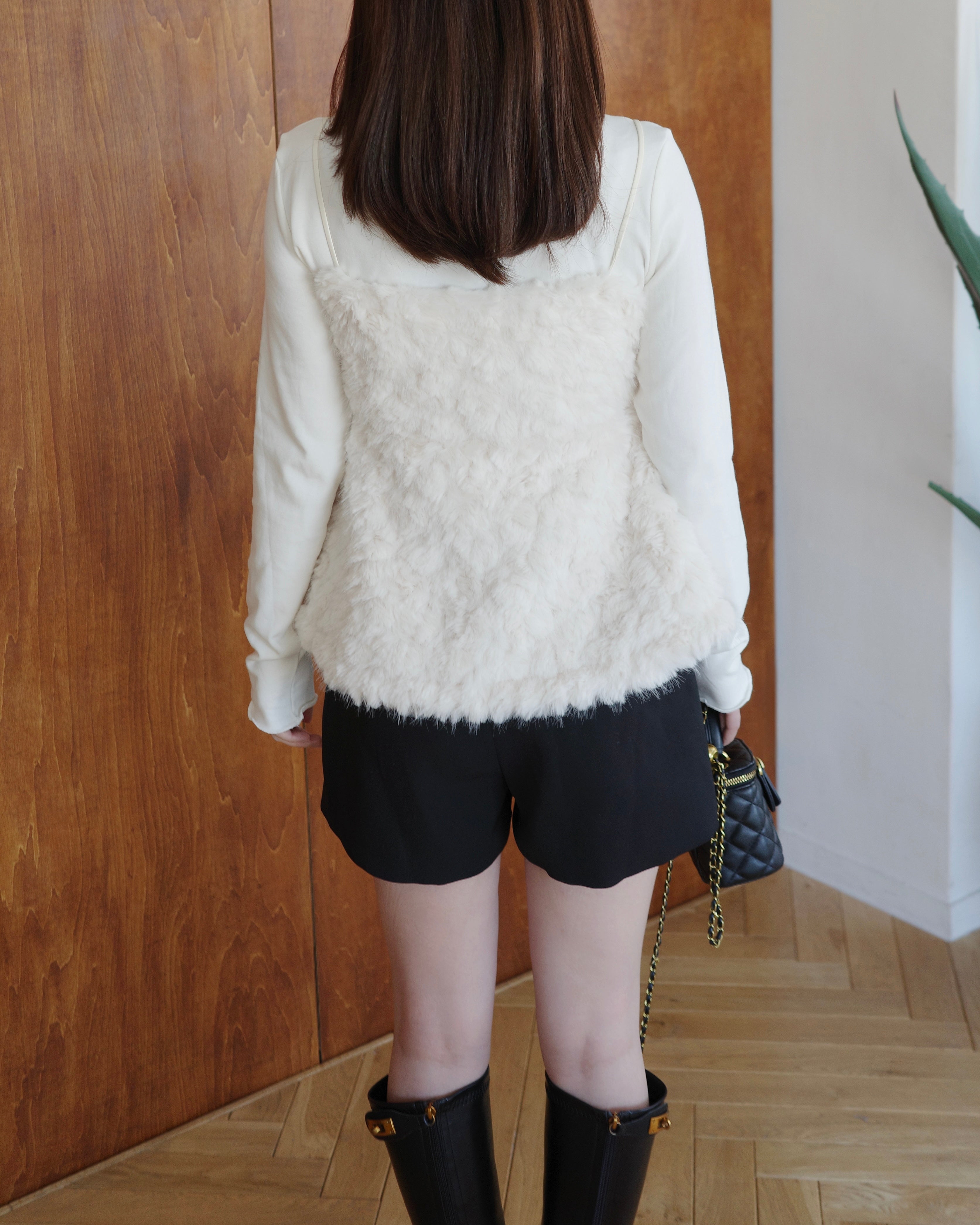 柔らかな肌触りが癖になるフェイクファー素材のビスチェがポイント。