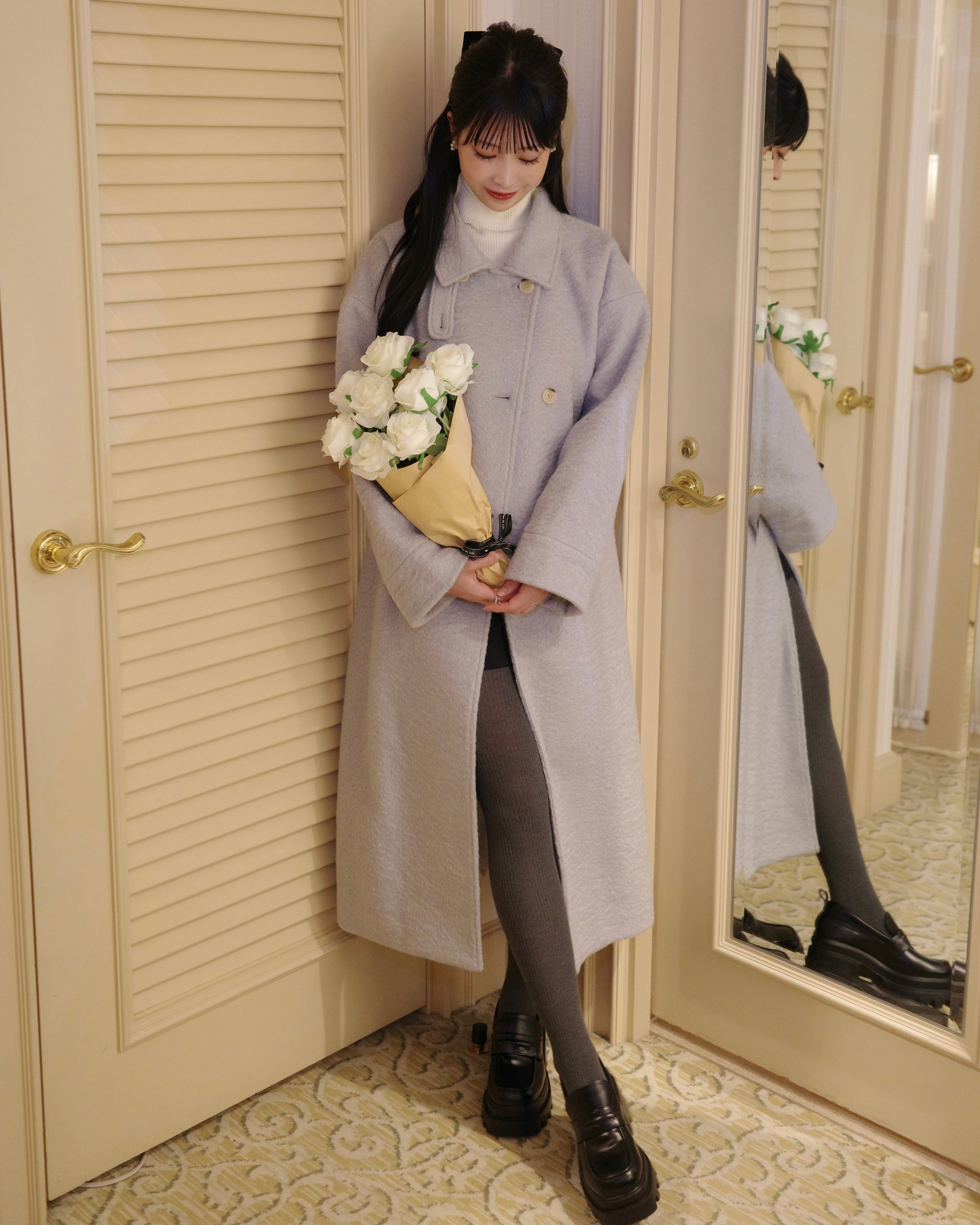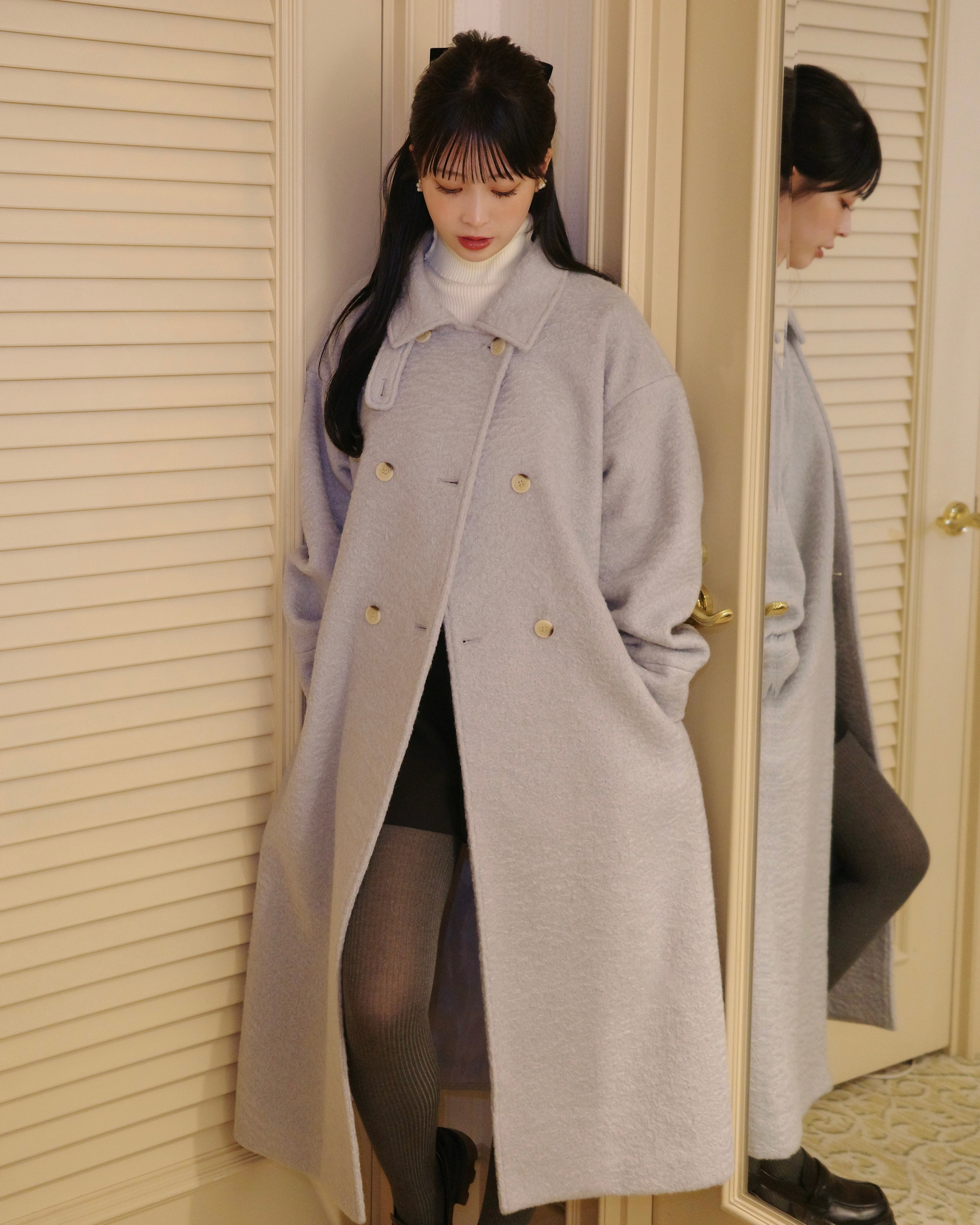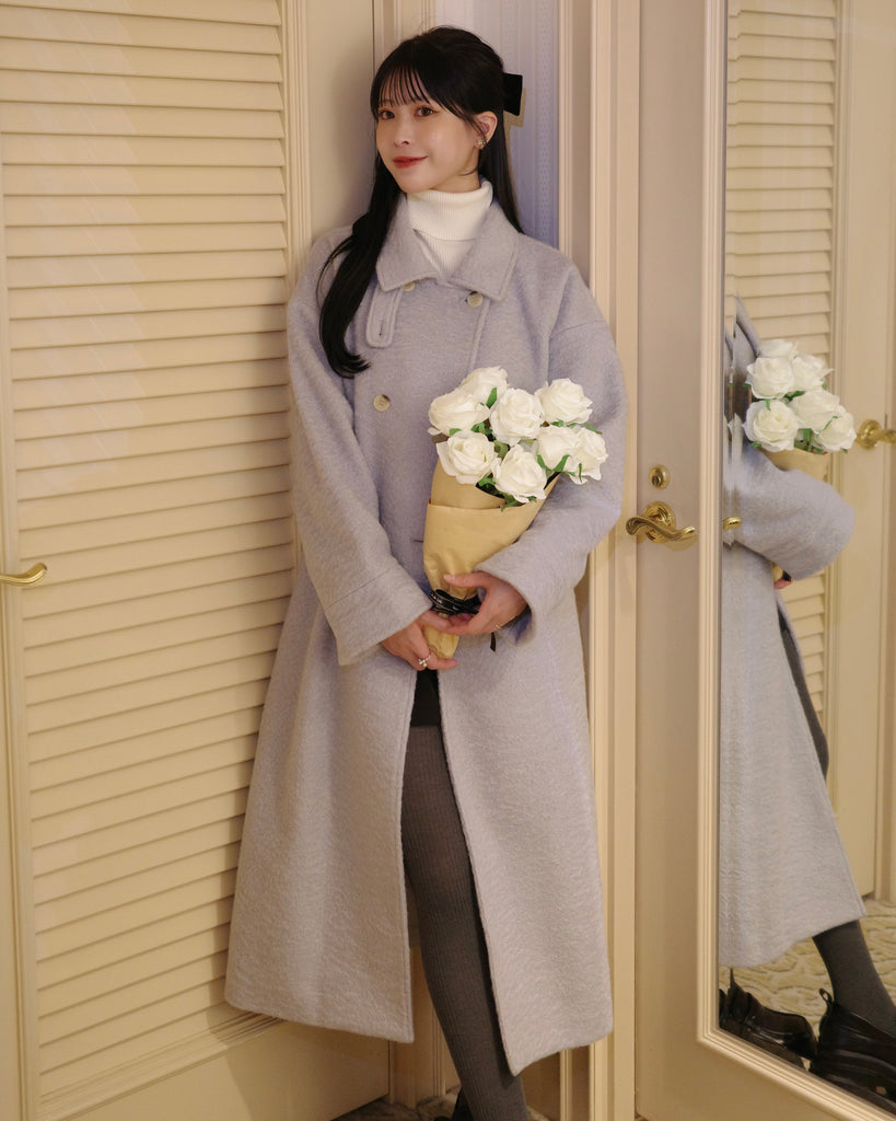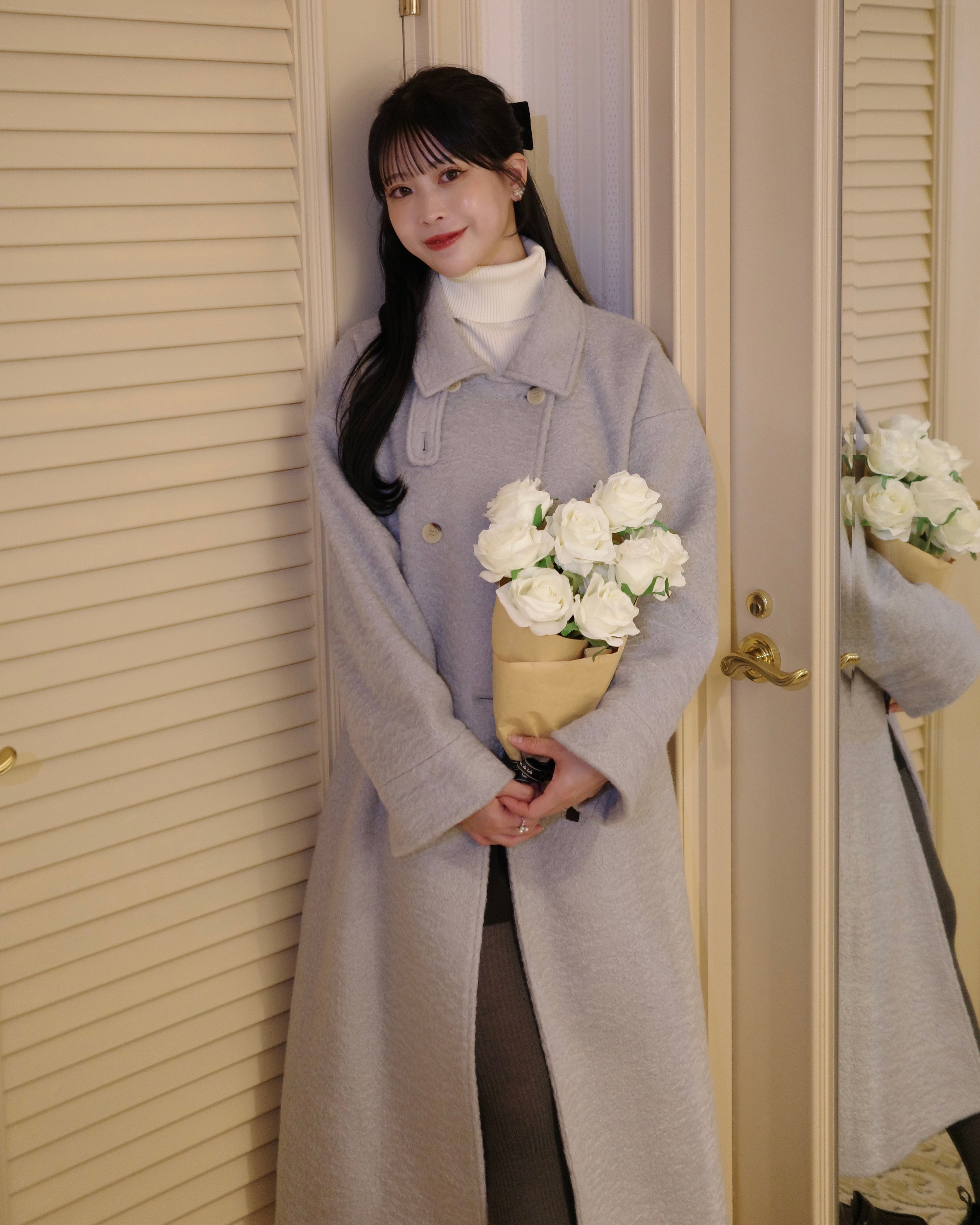 クラシカルなダブルボタンデザインに、やわらかなオフホワイトのカラーが映え、
