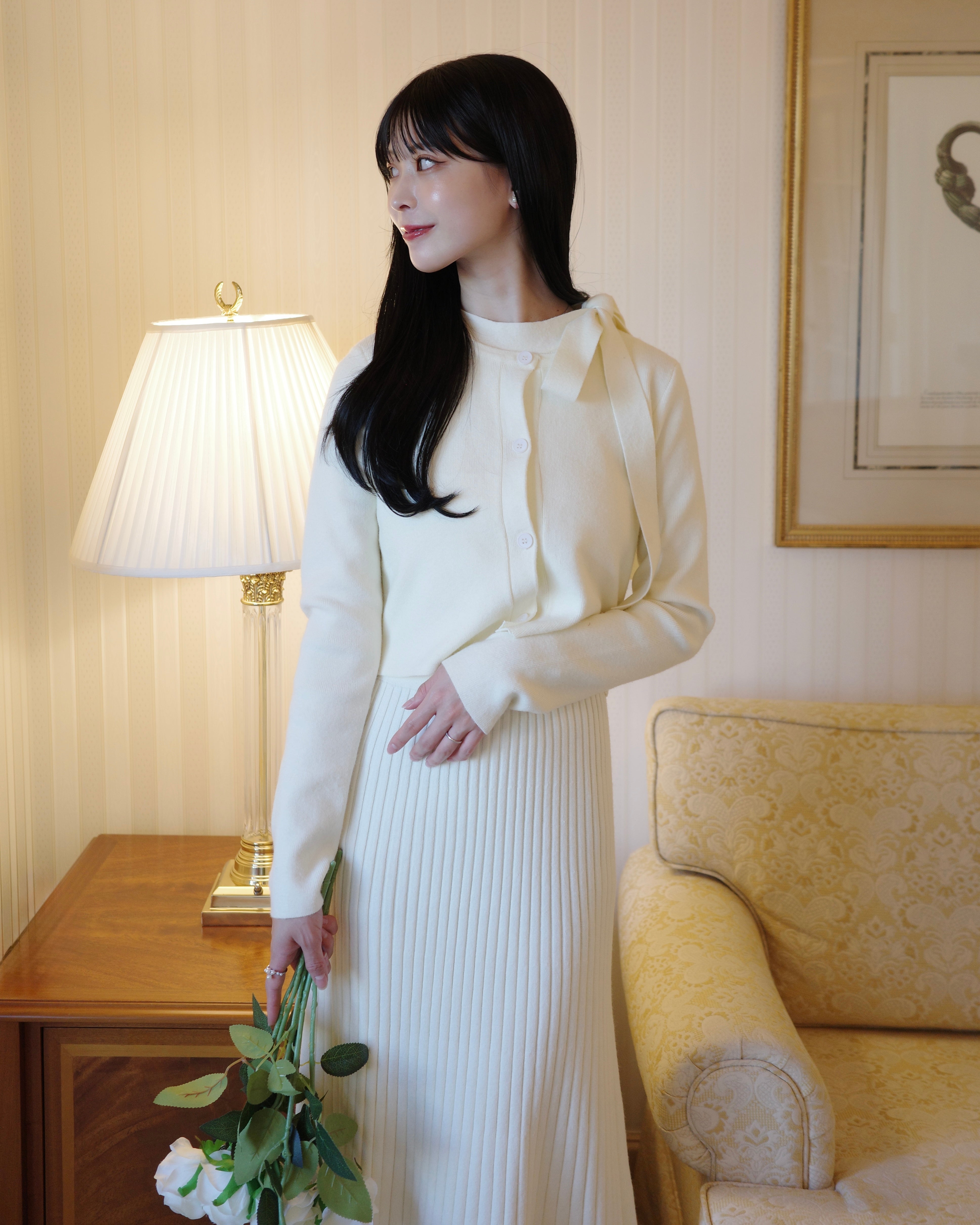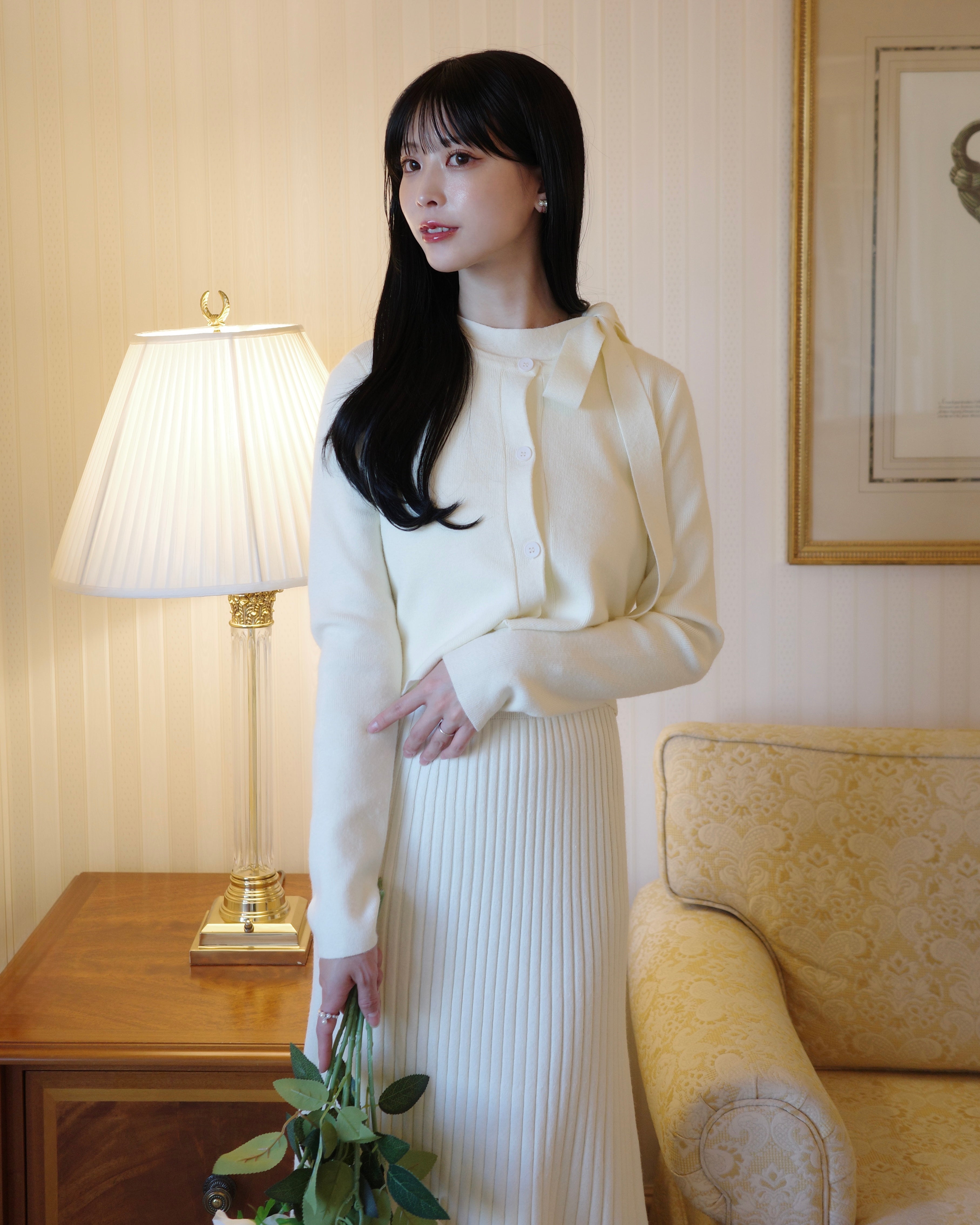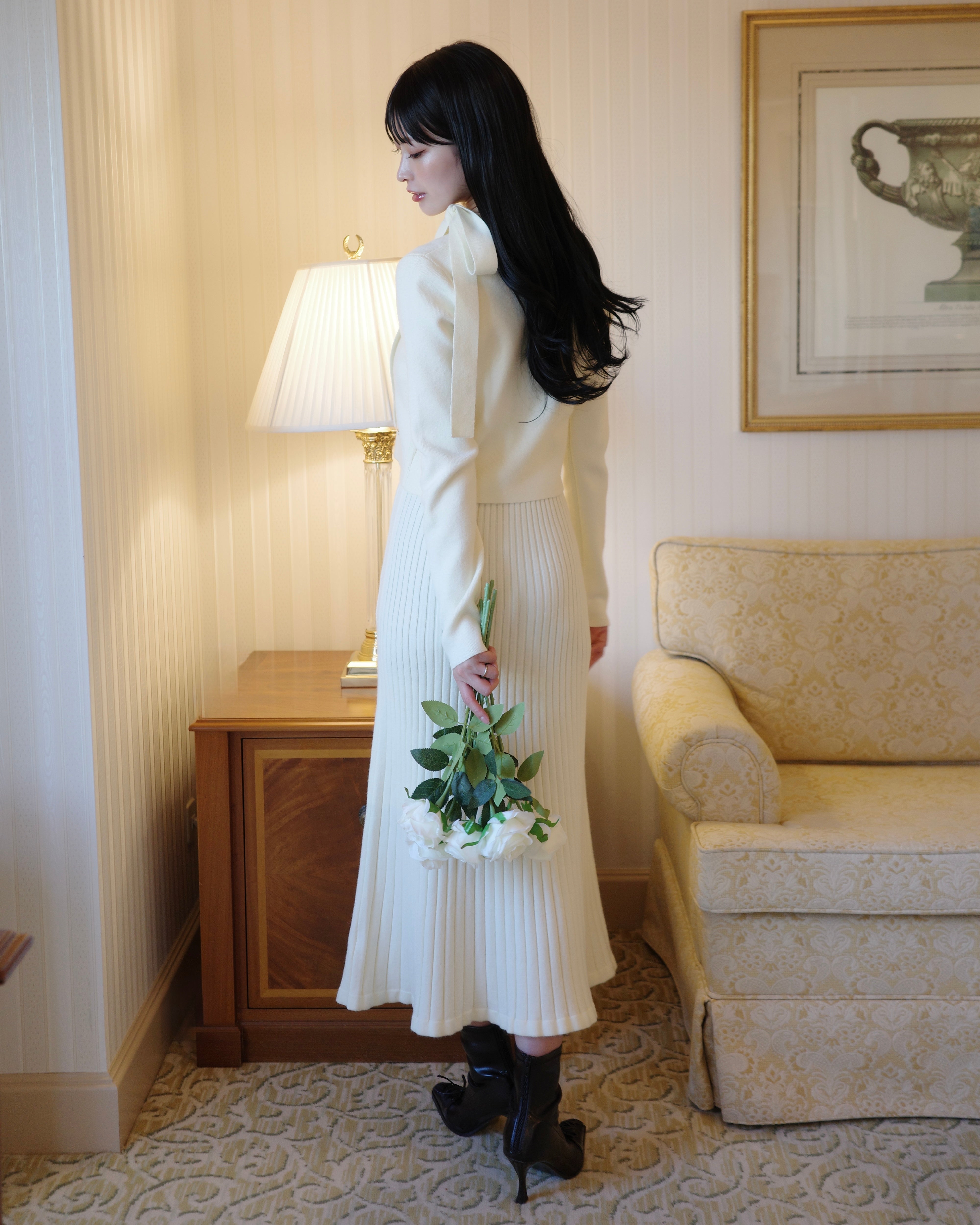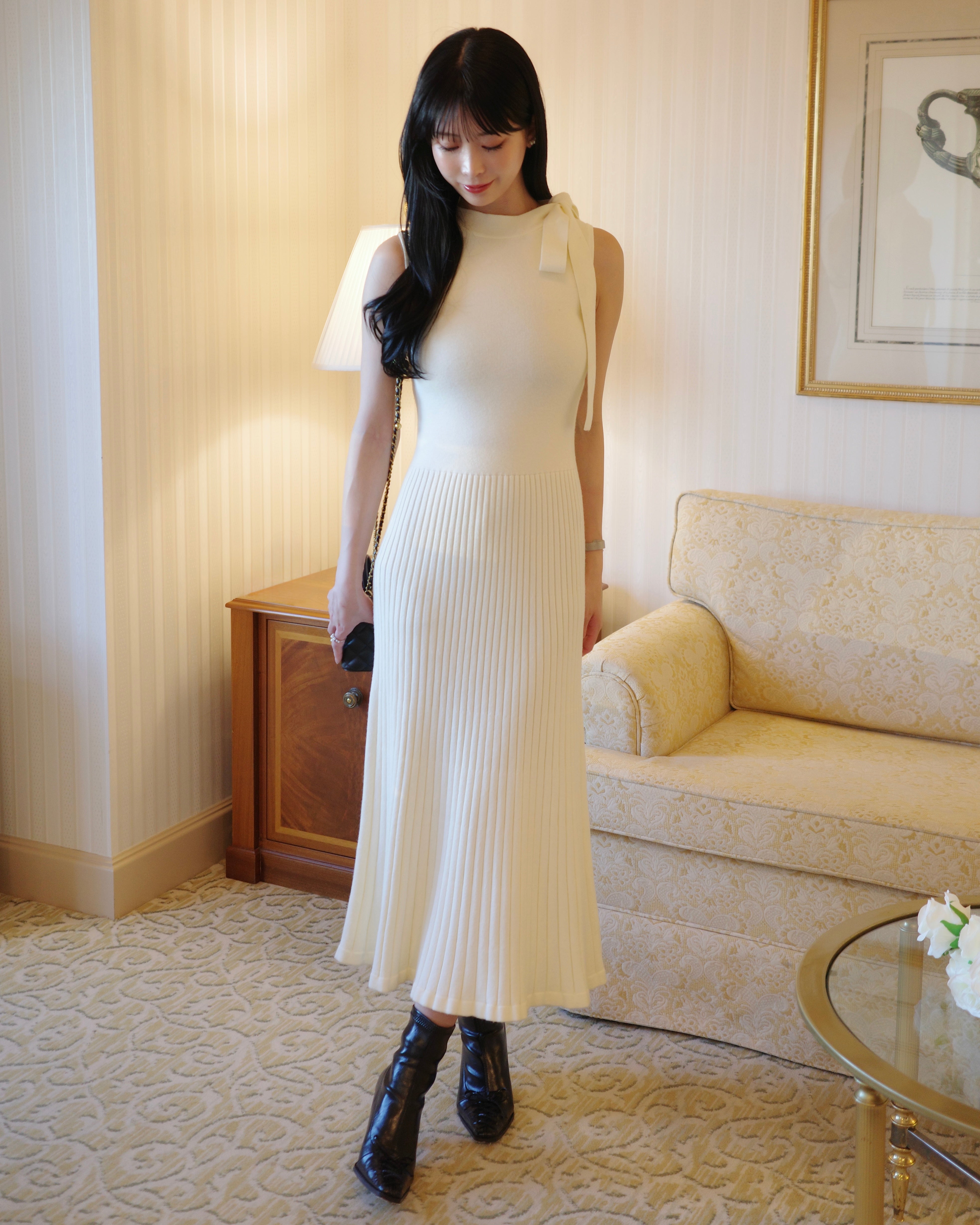 サイドリボンデザインのワンピースはシンプルながらも上品な印象に。