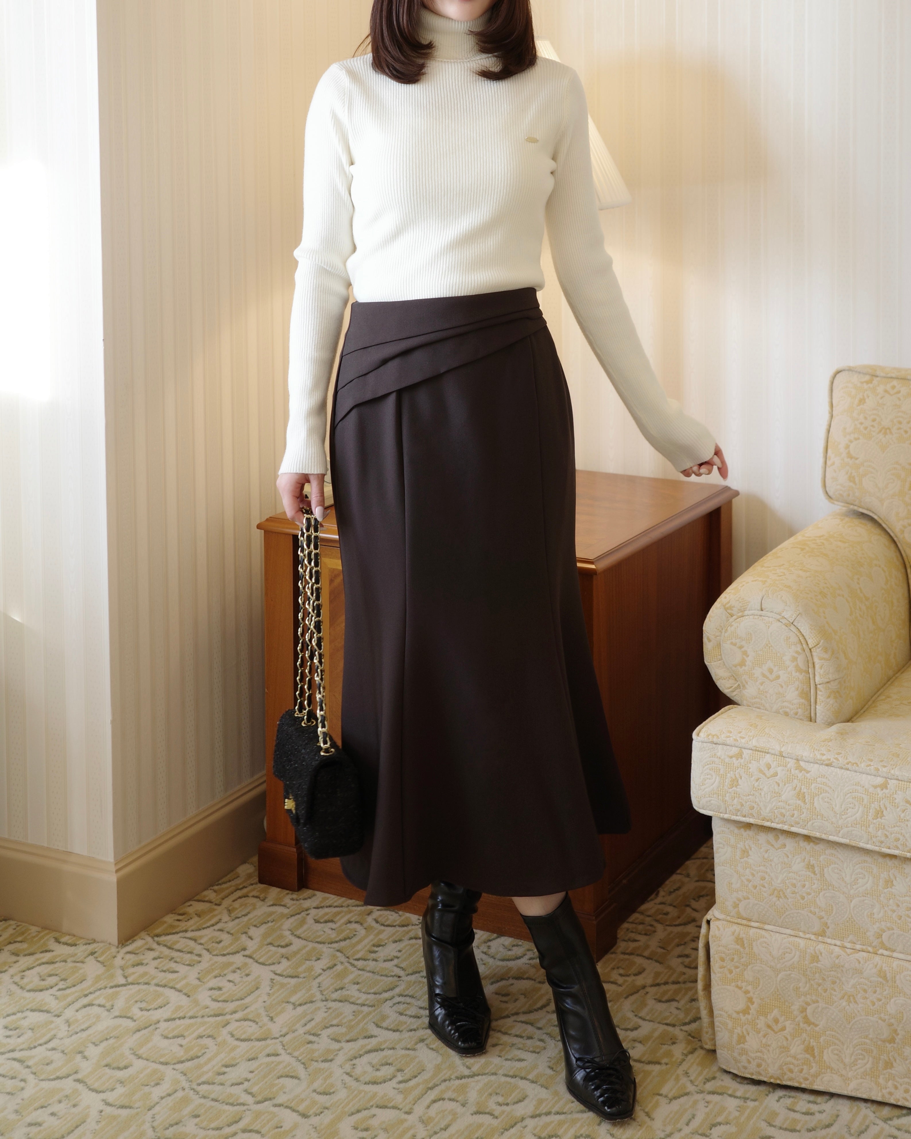 ミディ丈なので、ブーツやパンプス合わせがおすすめです。