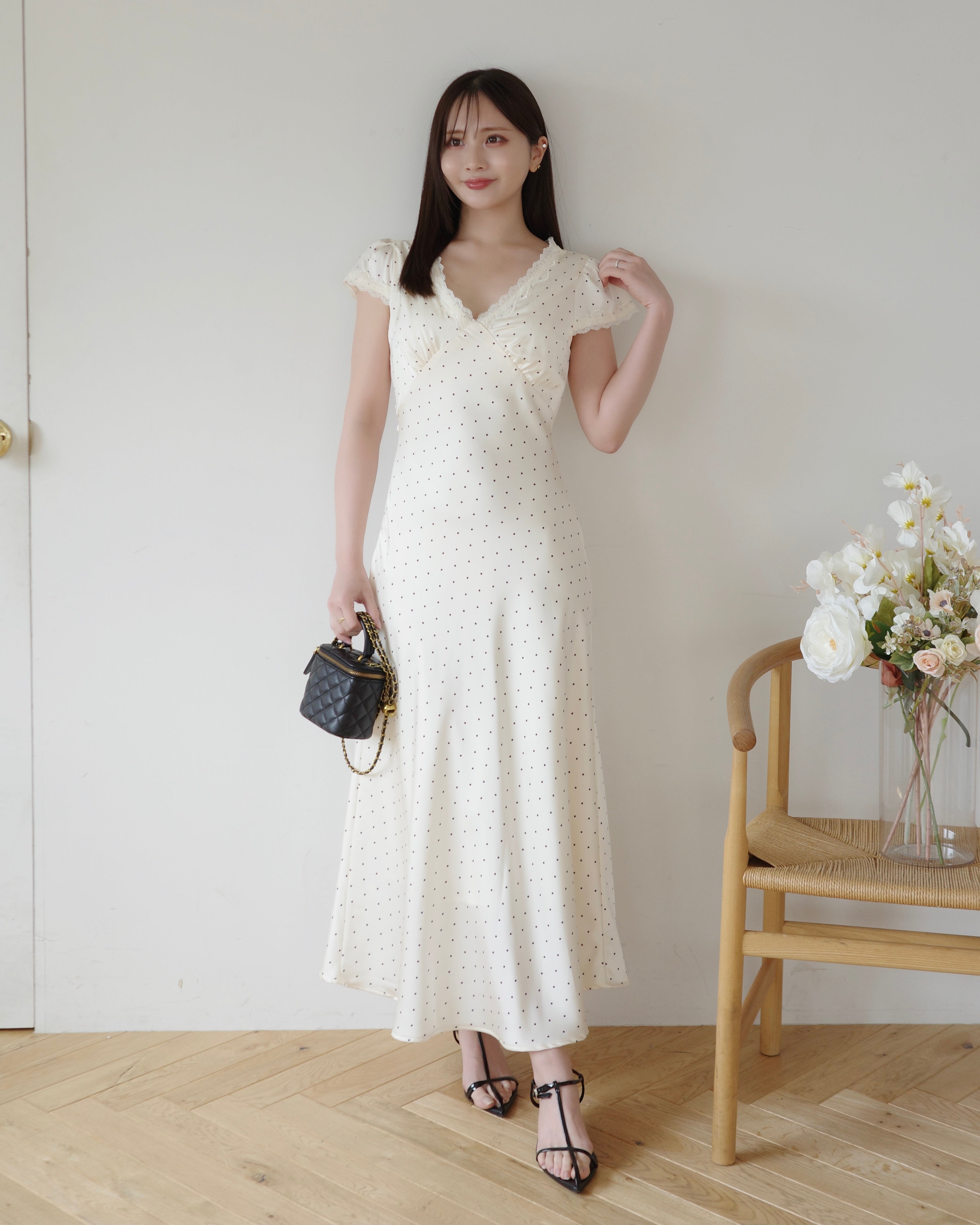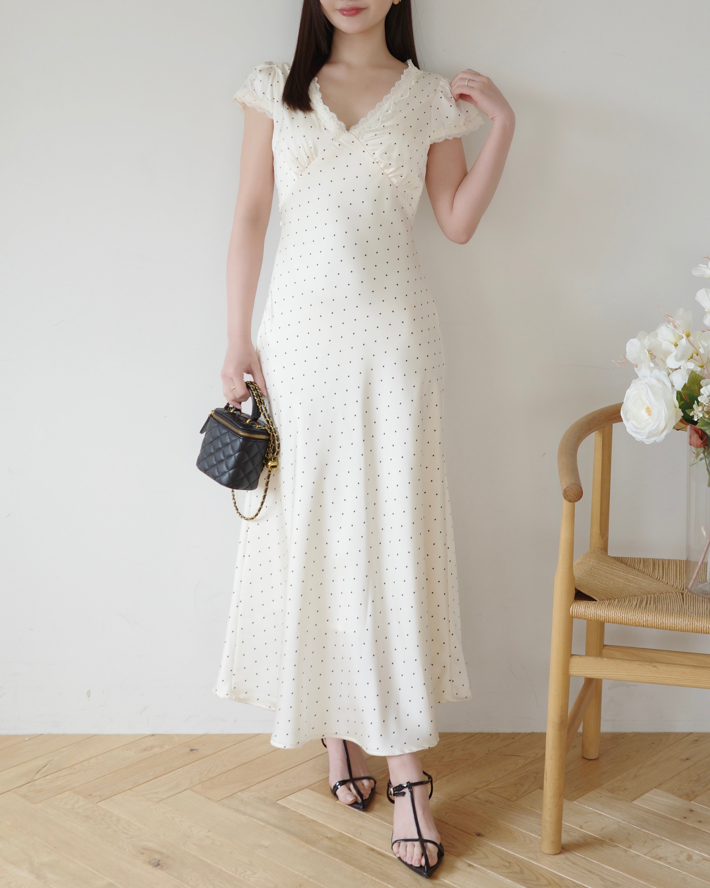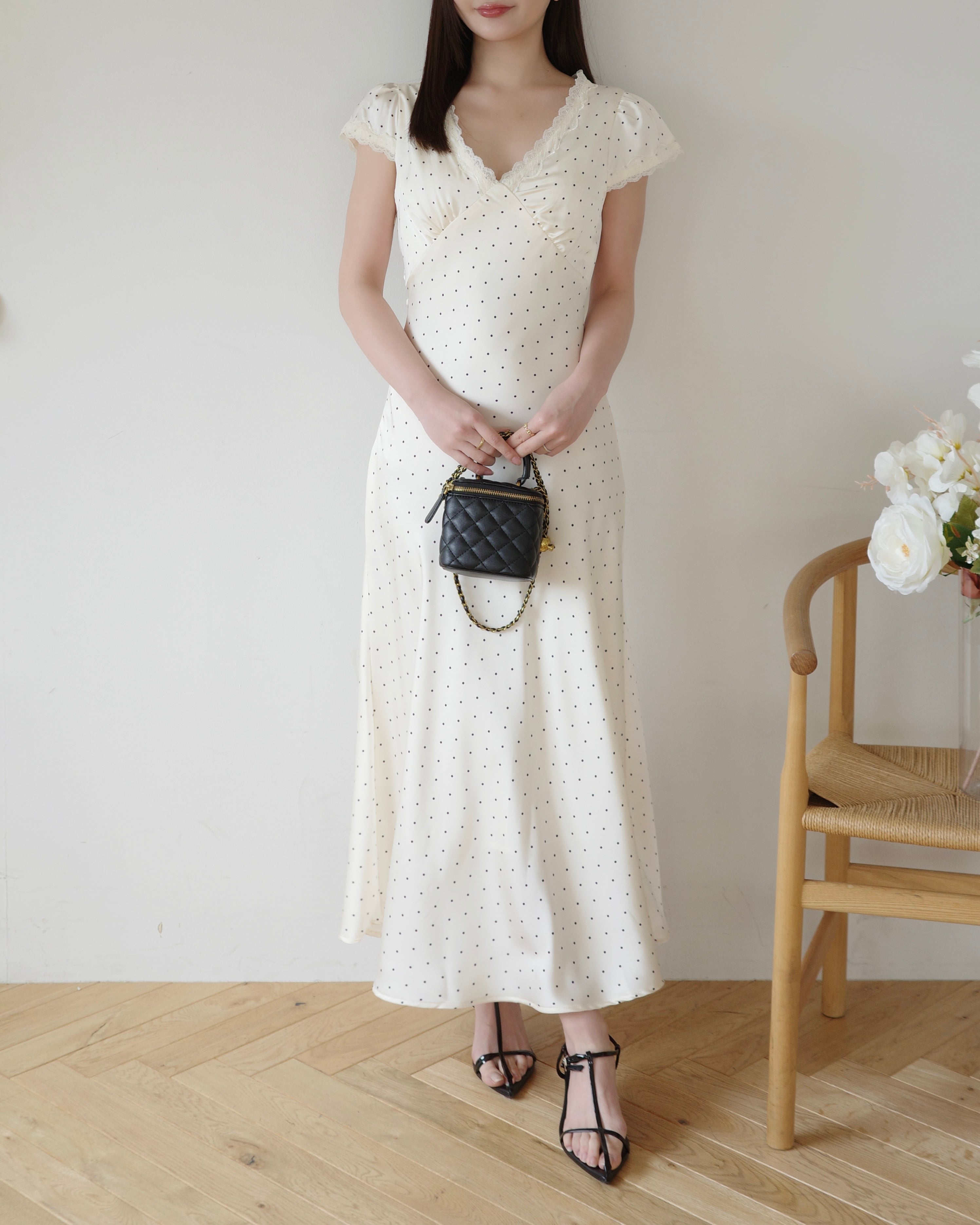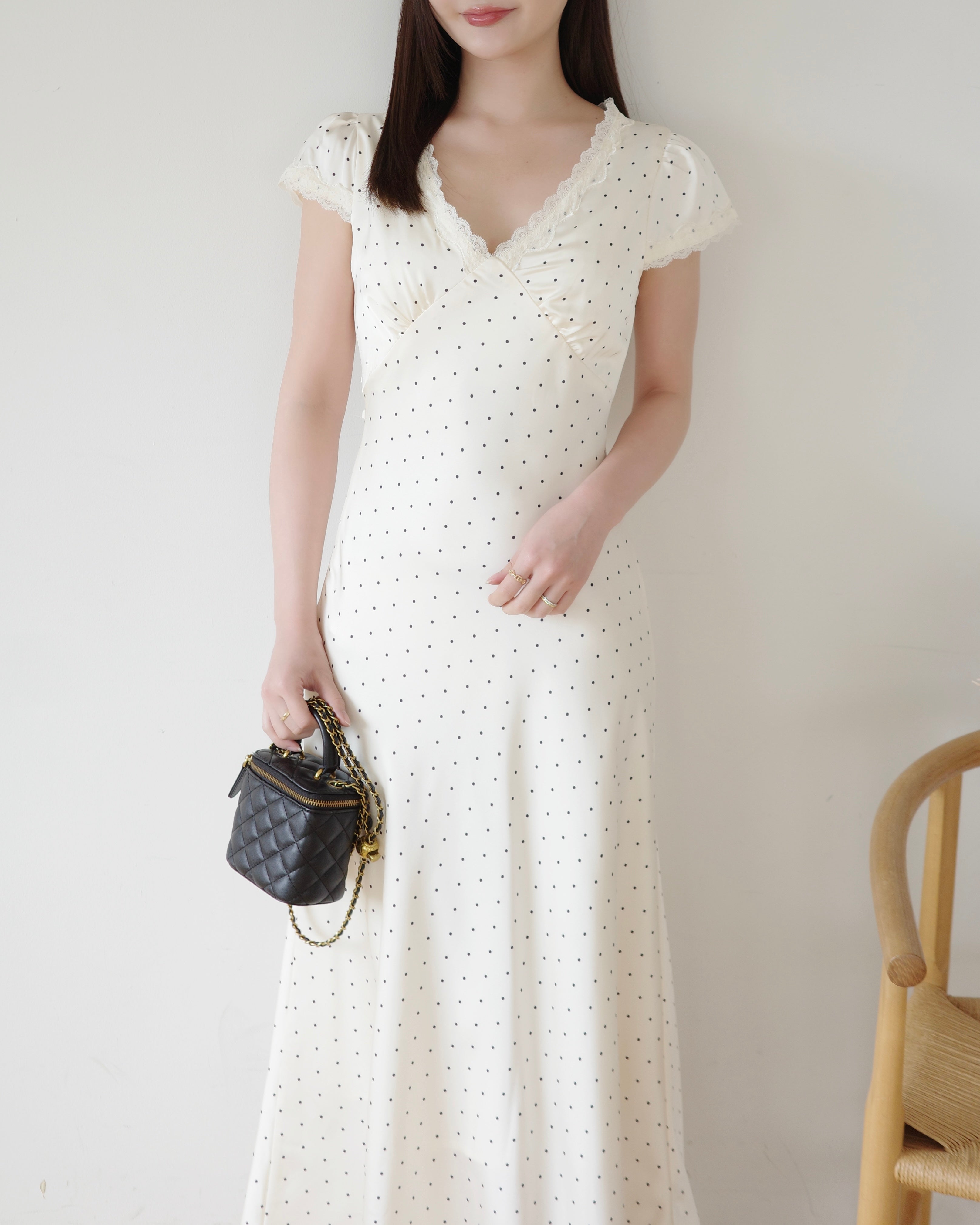 細かいドット柄とデコルテにはレースをあしらい、上品さをプラス。