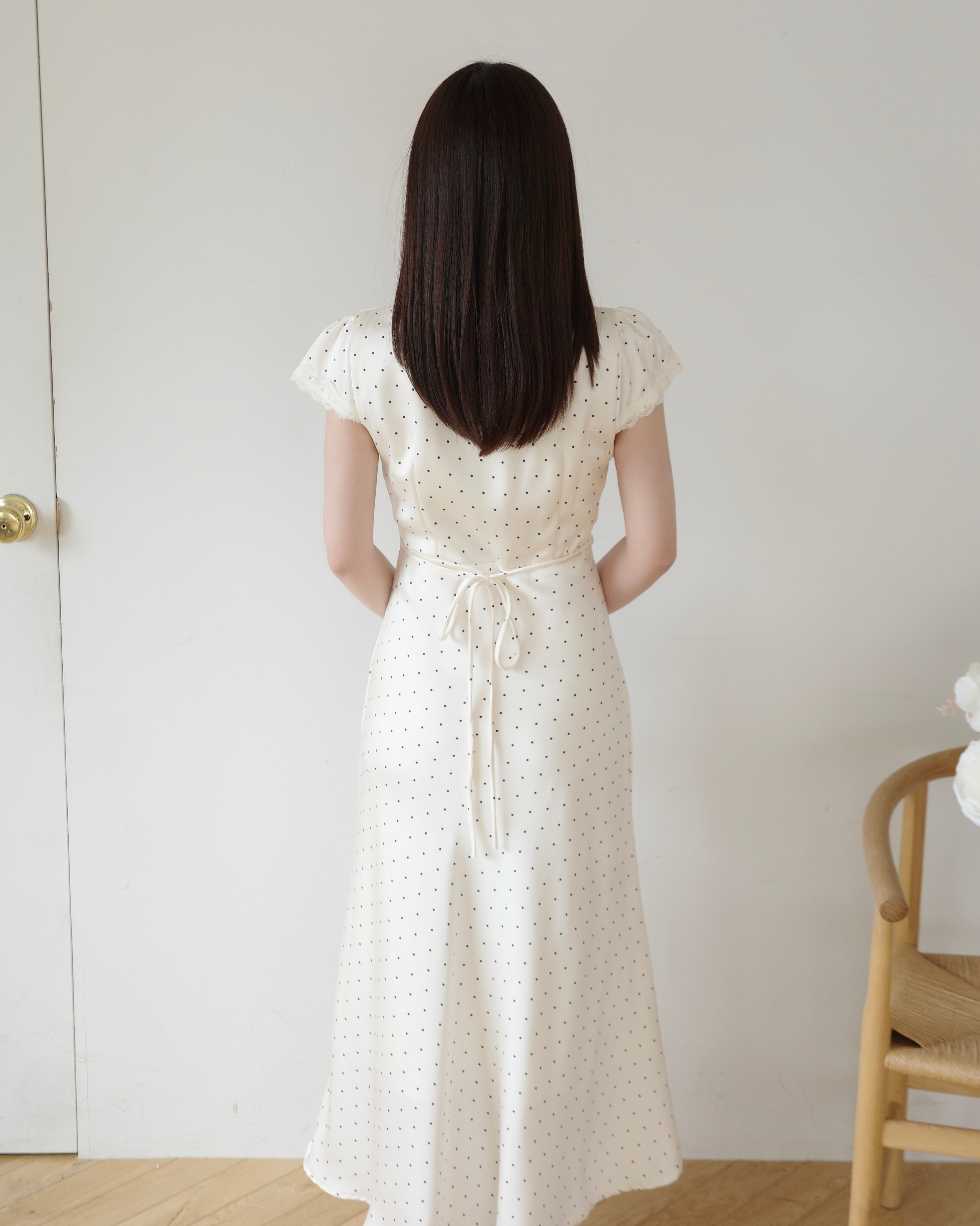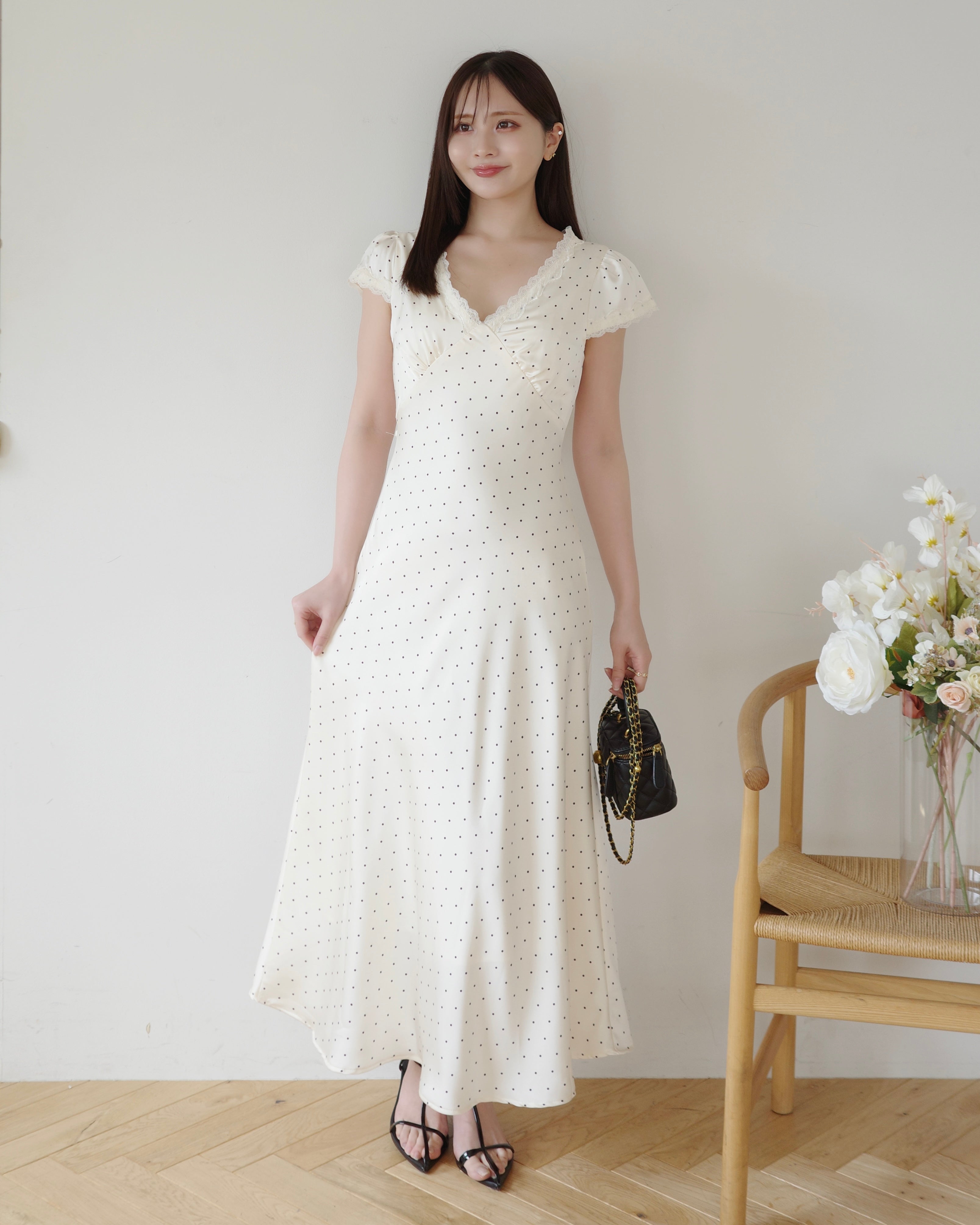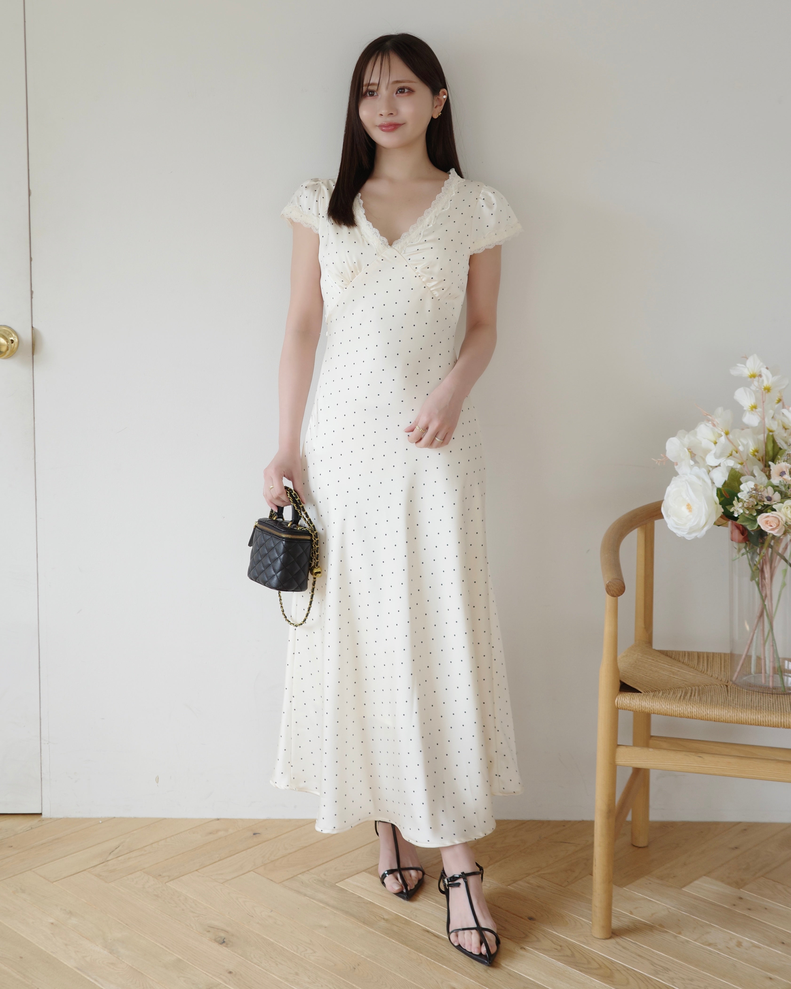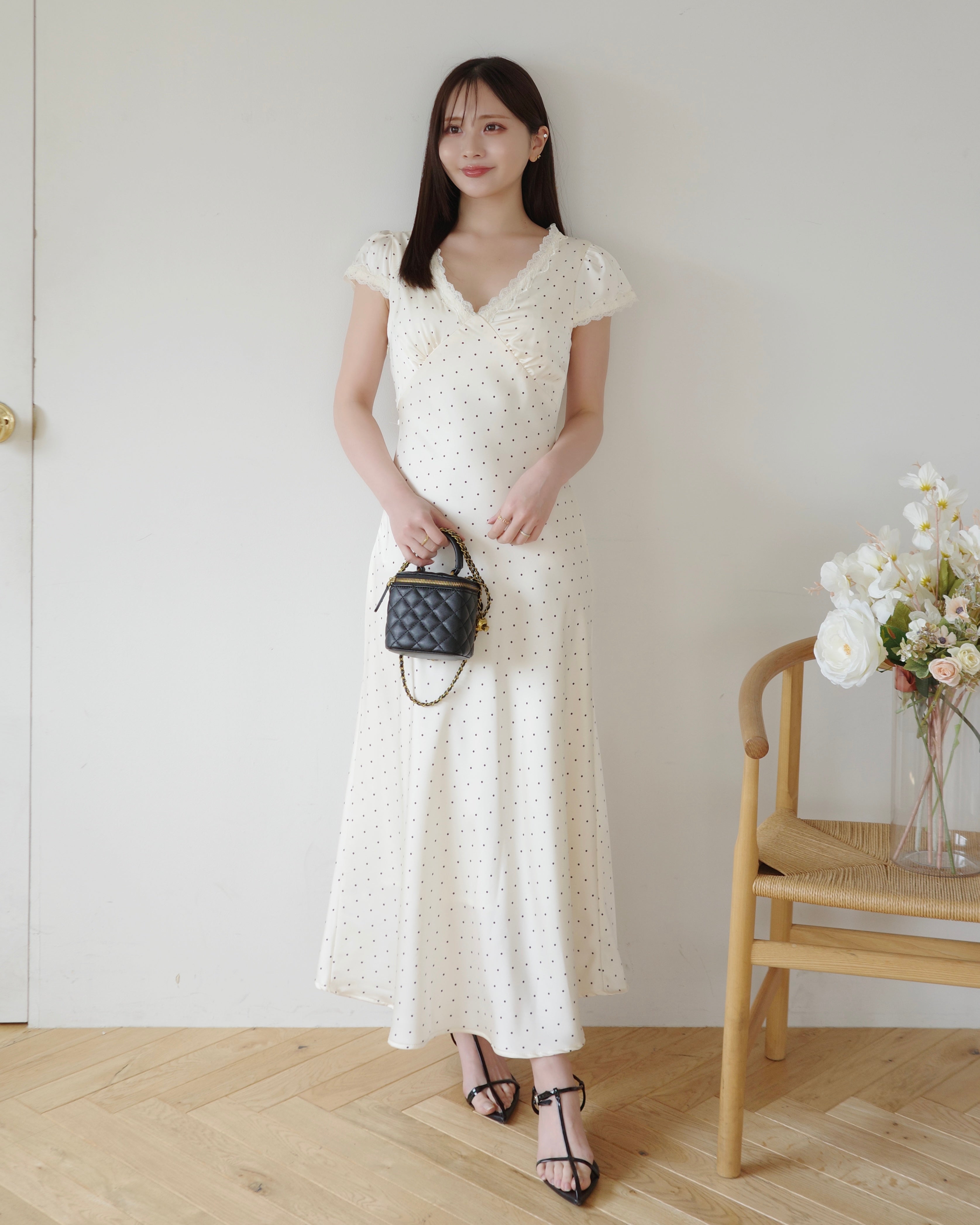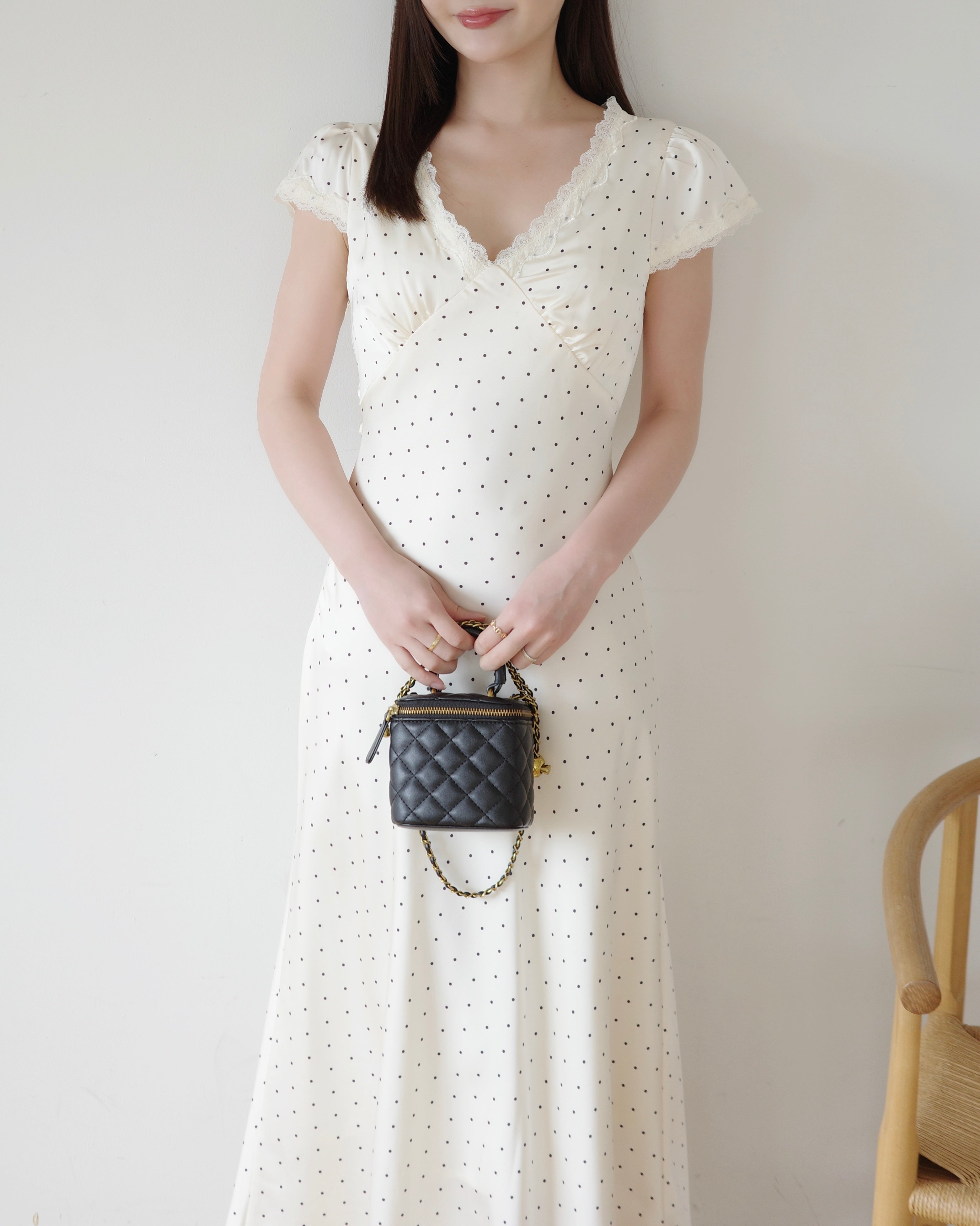 細かいドット柄とデコルテにはレースをあしらい、上品さをプラス。
