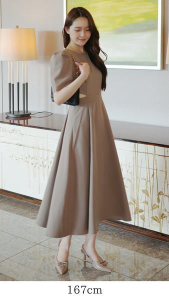 Aラインに広がる裾とパフスリーブが上品さと女性らしさを演出します。