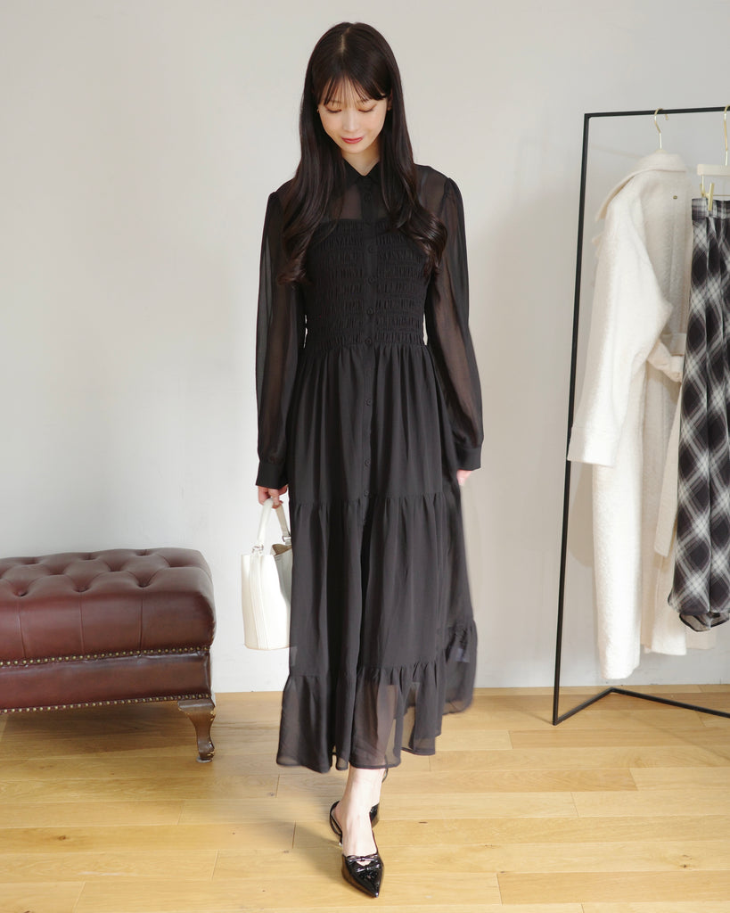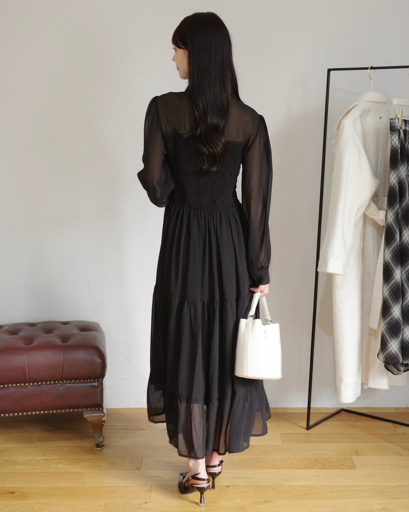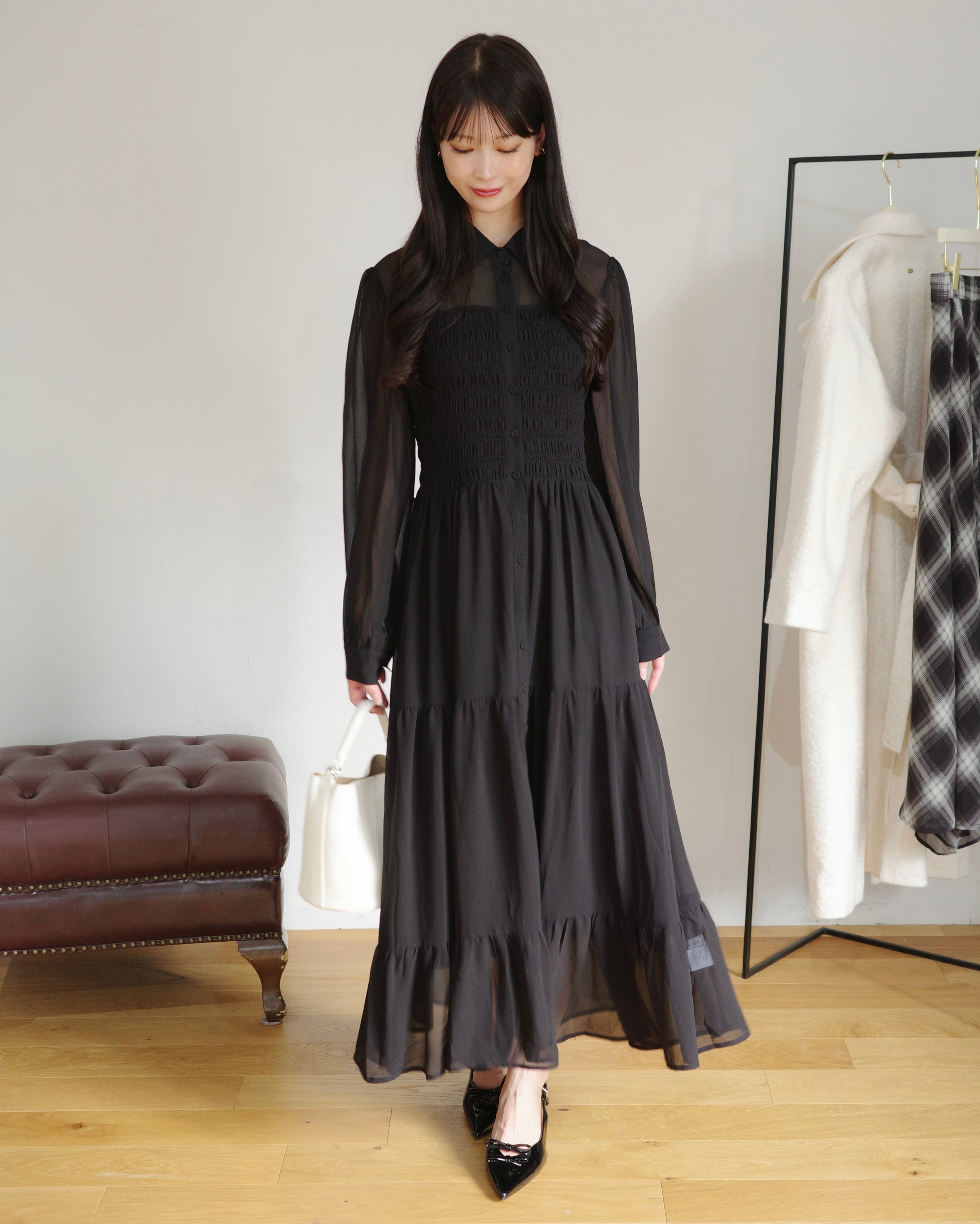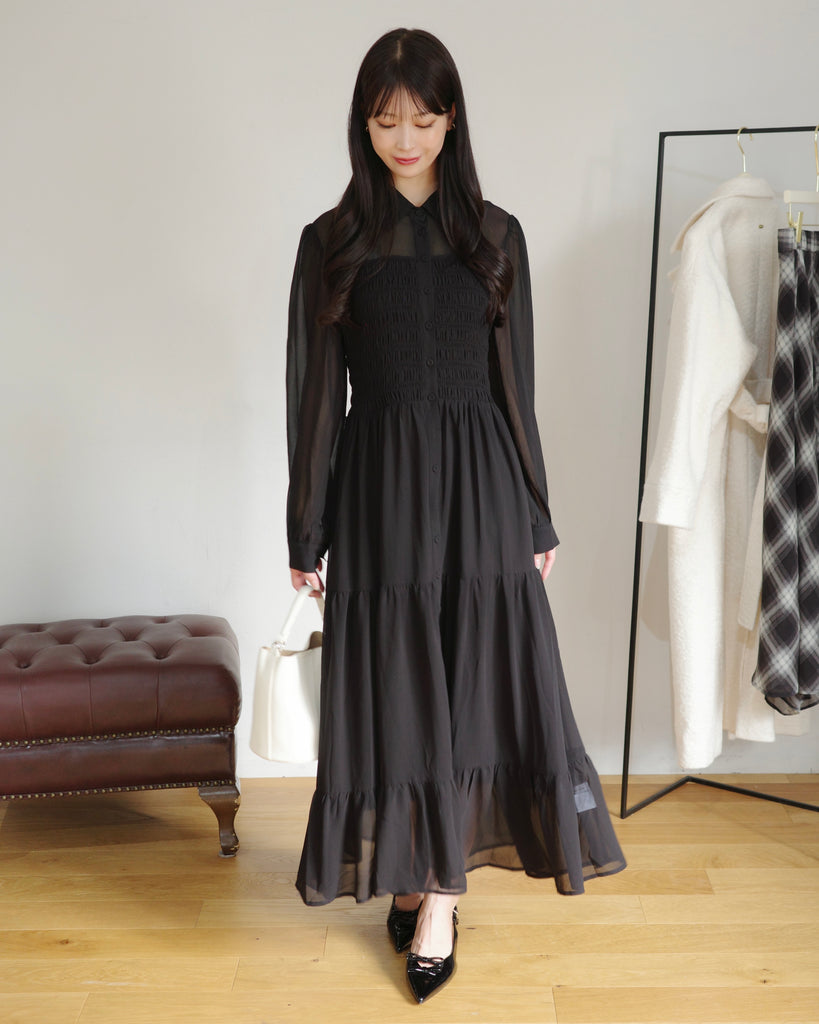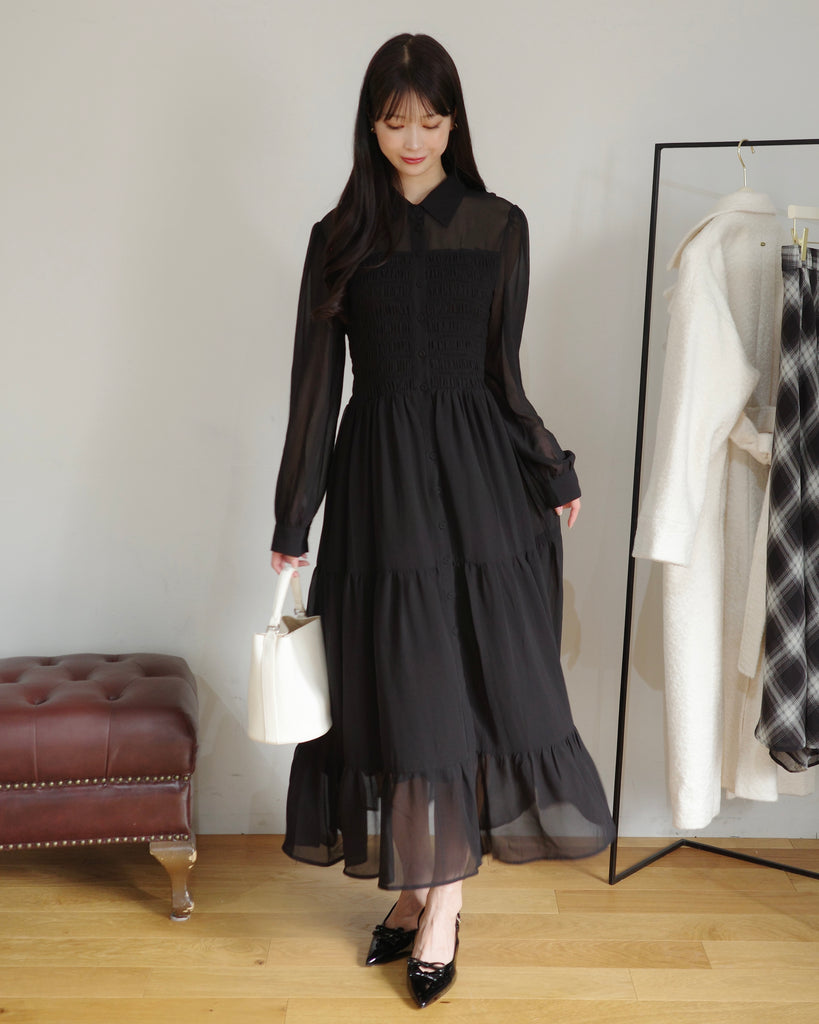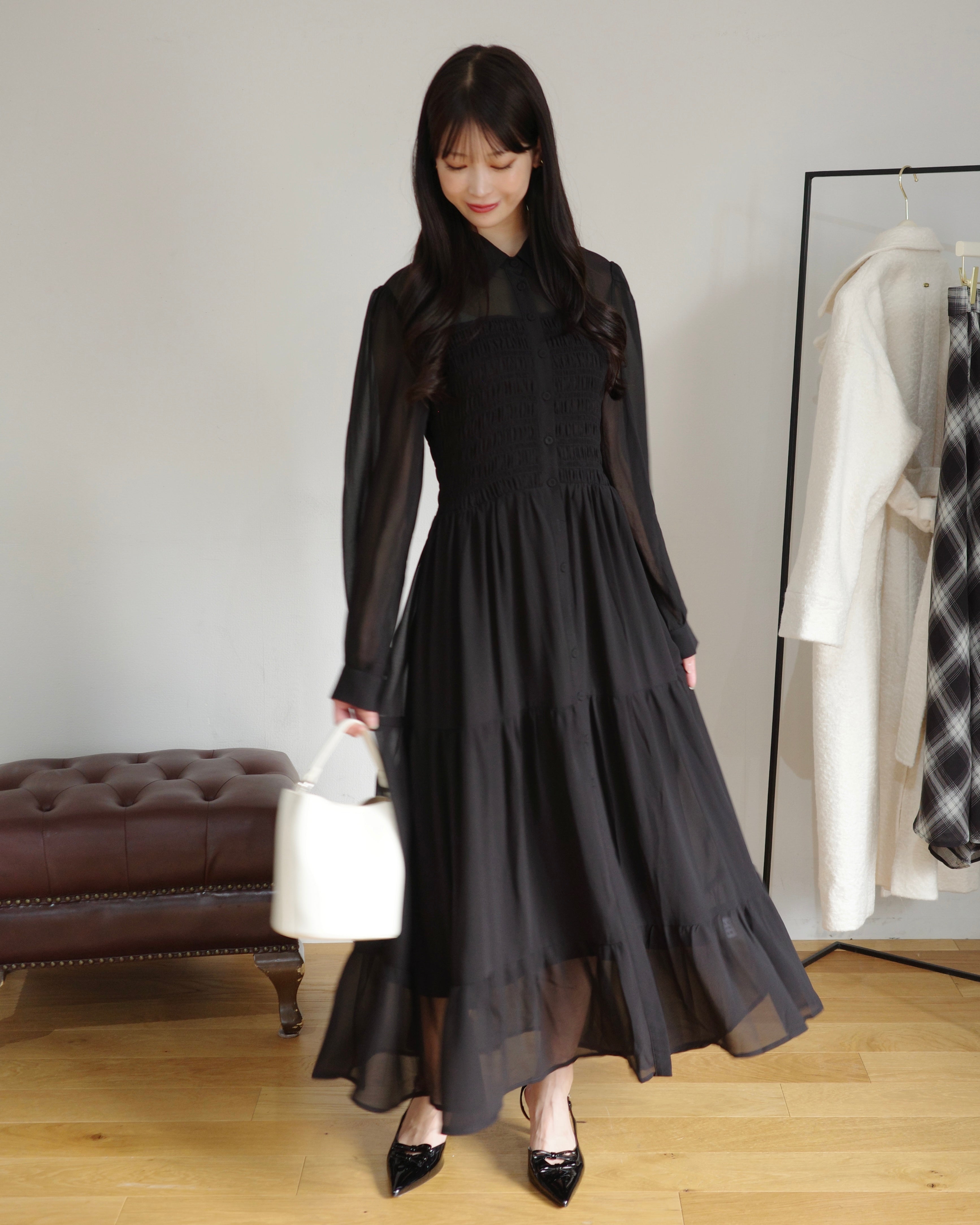 サラッとしたシフォン素材で、広がりすぎない上品なティアードワンピース。