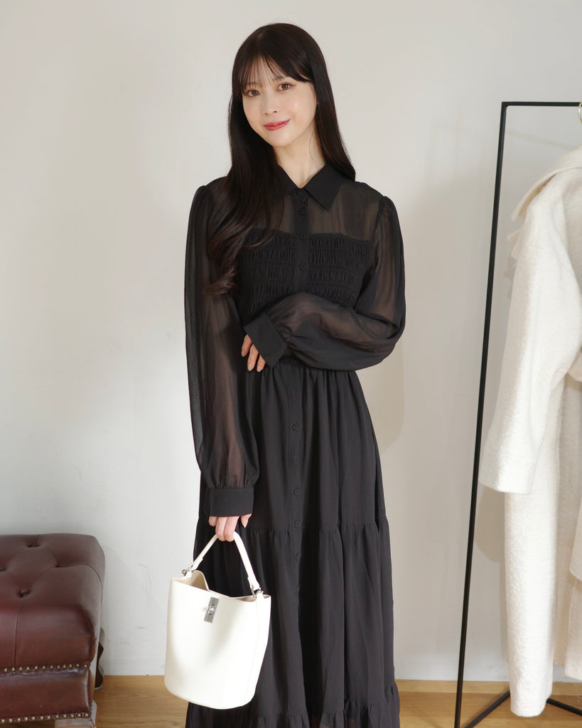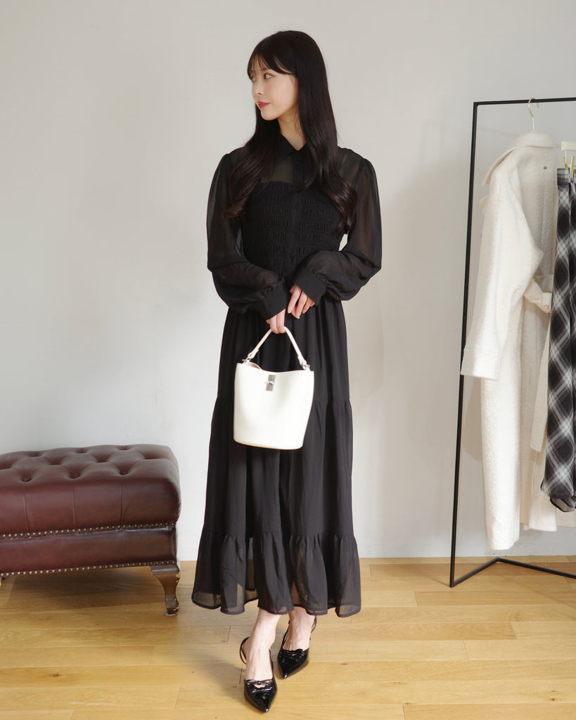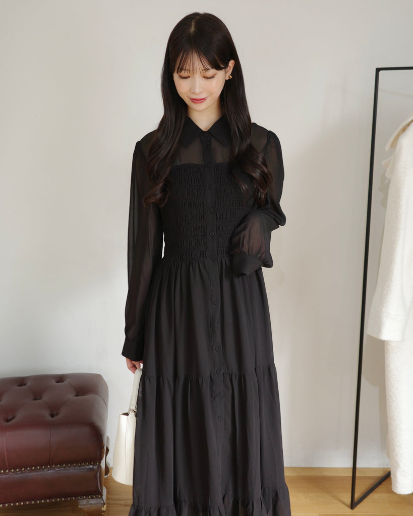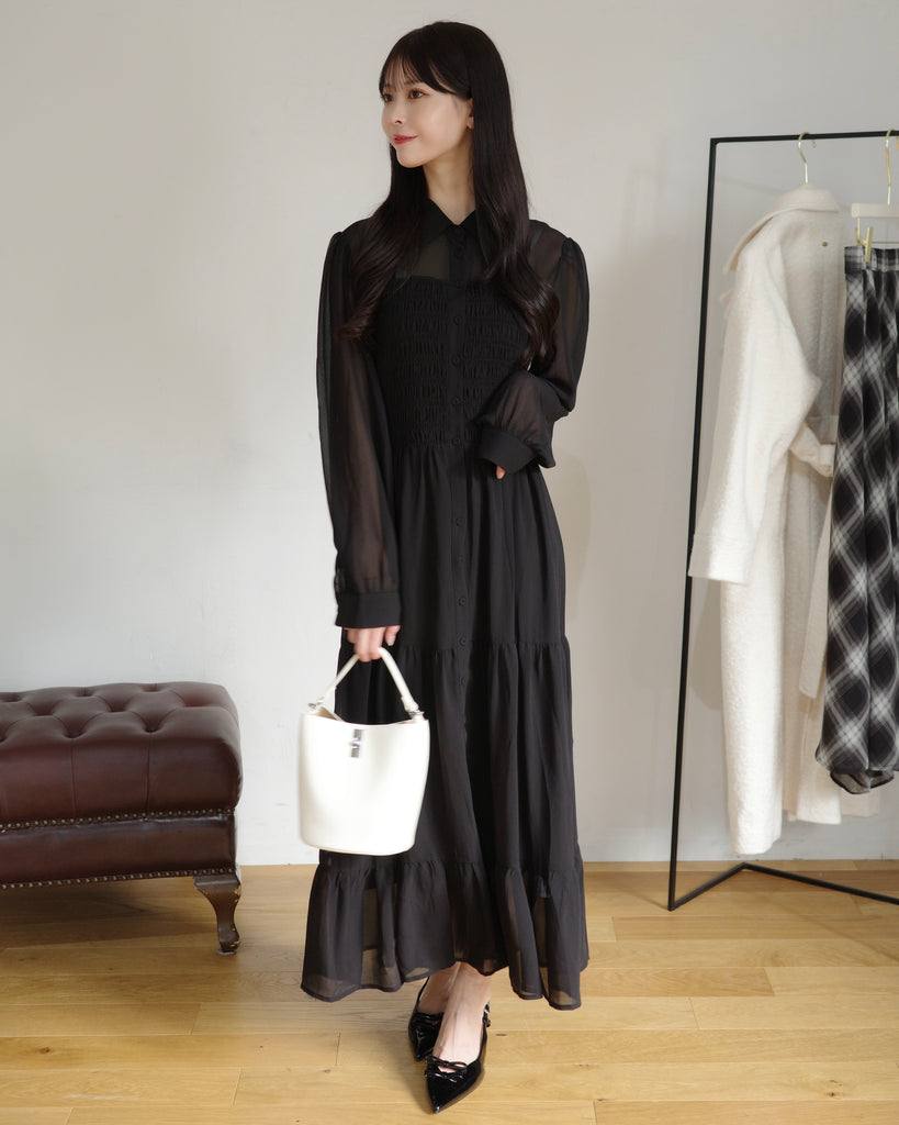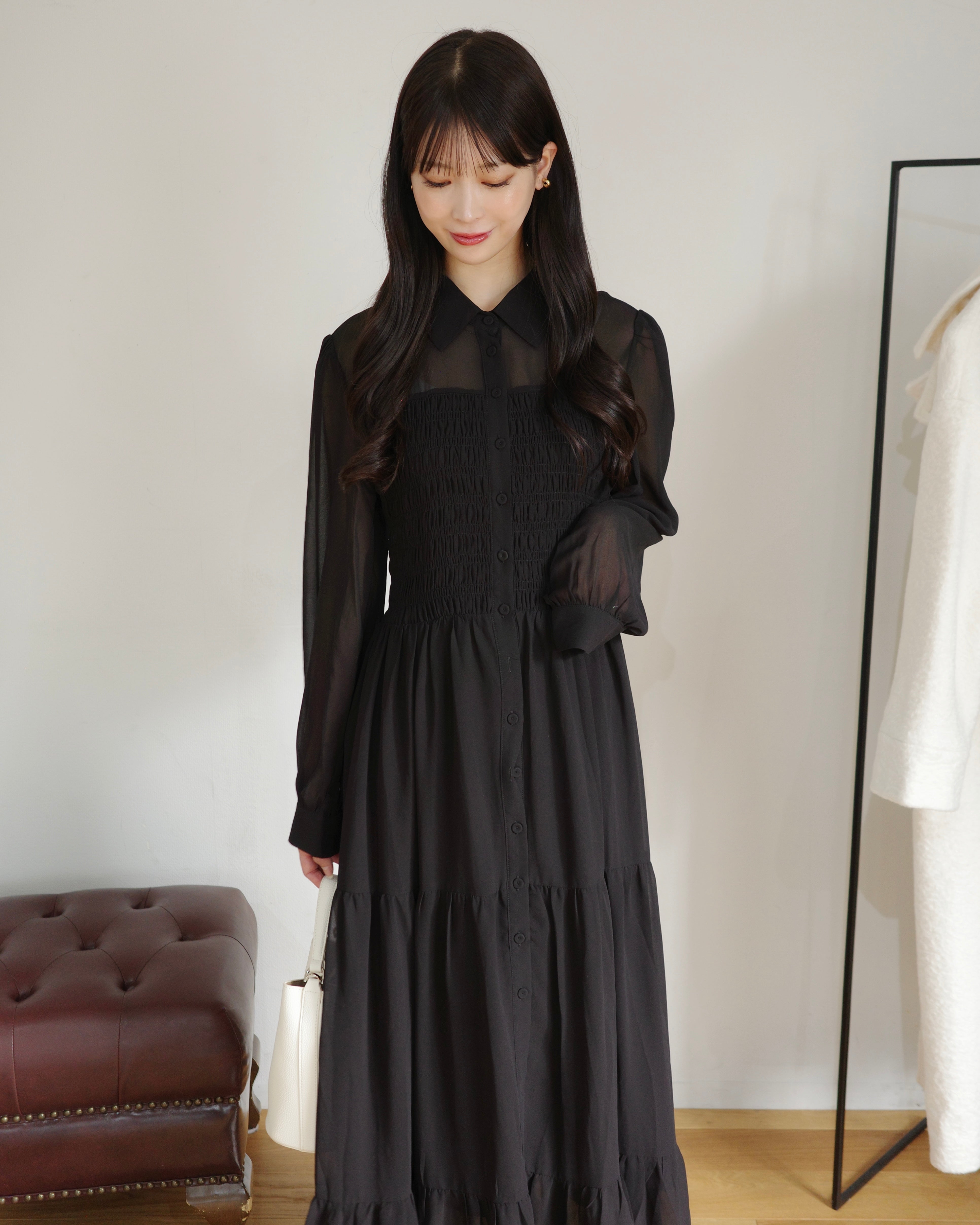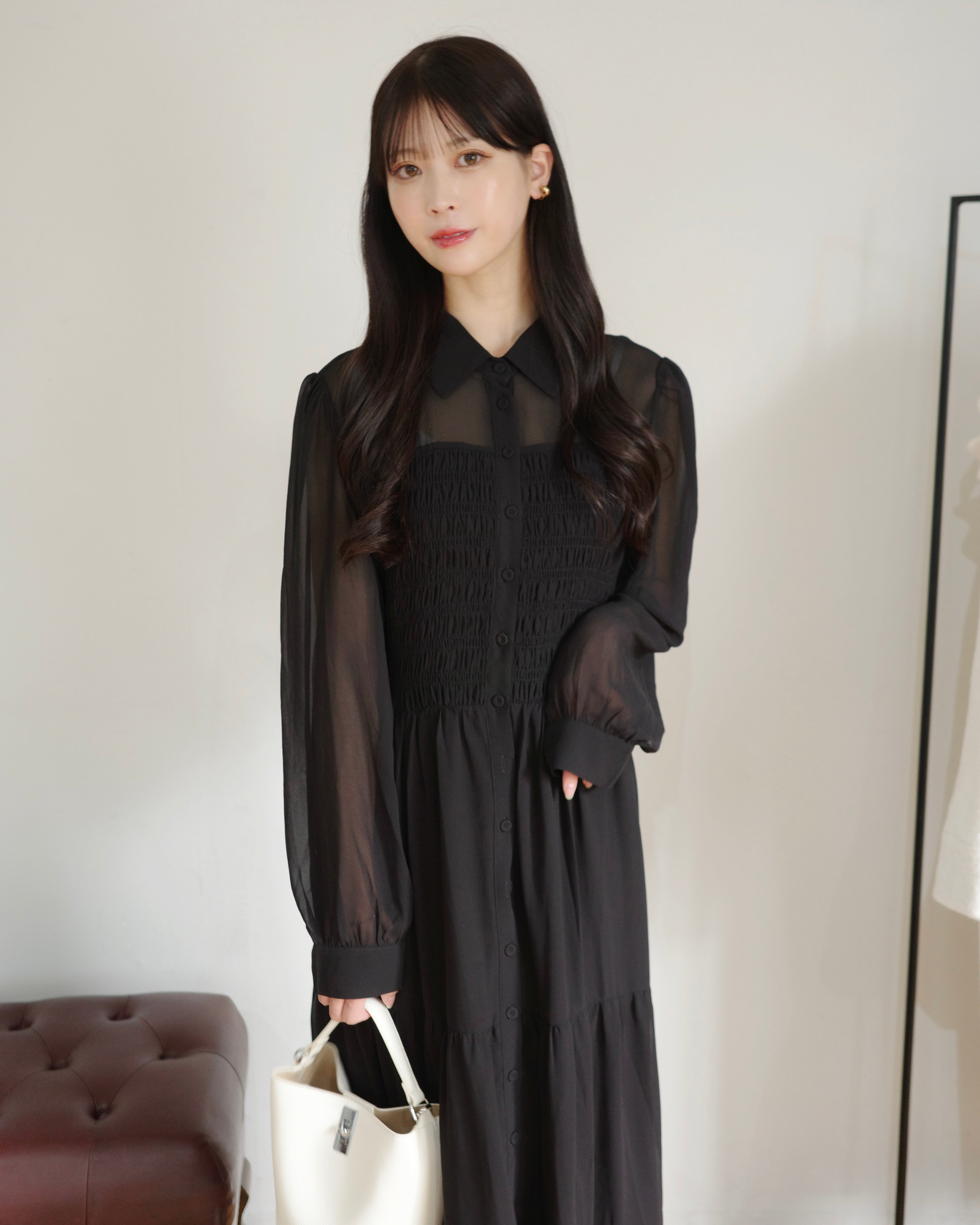 サラッとしたシフォン素材で、広がりすぎない上品なティアードワンピース。