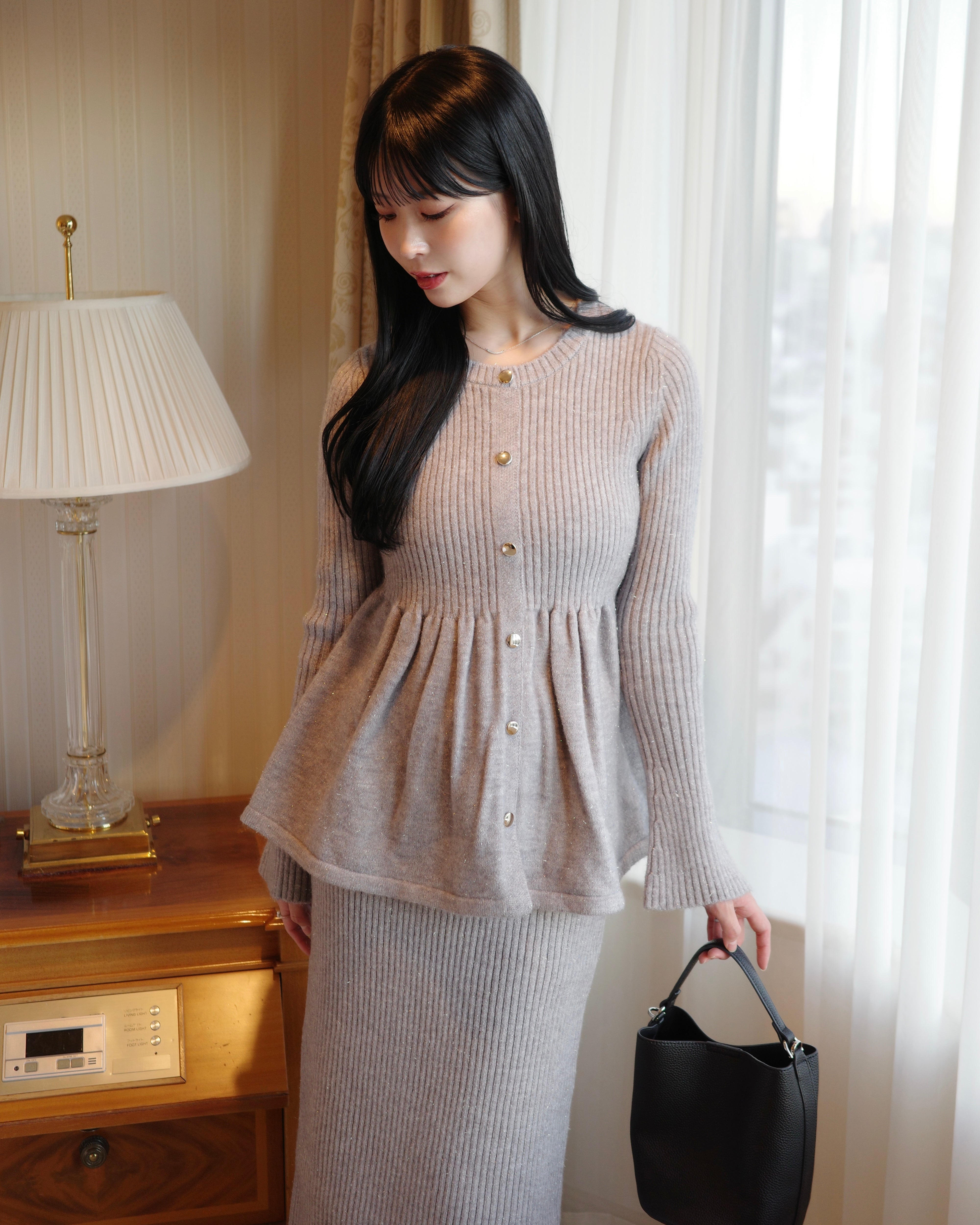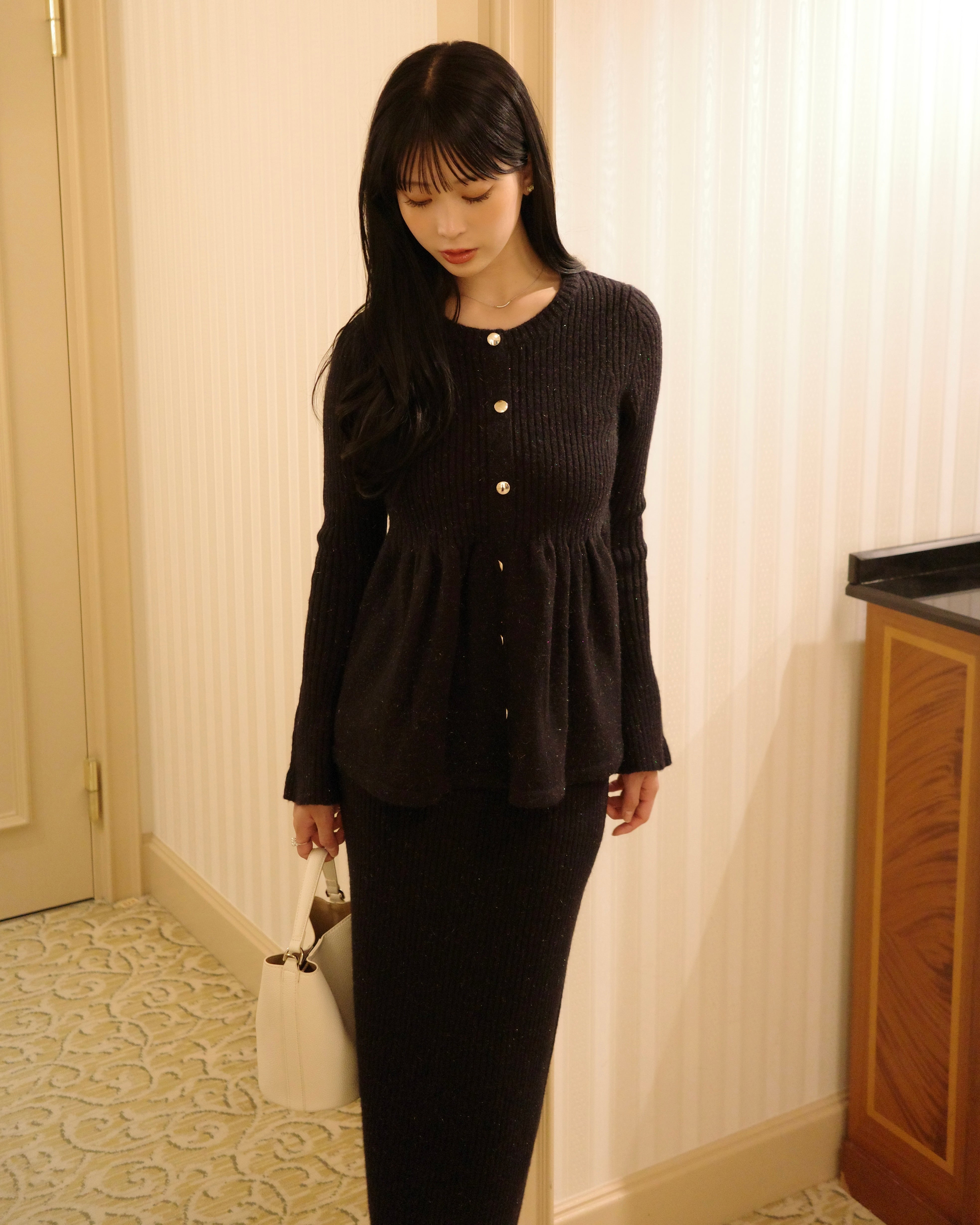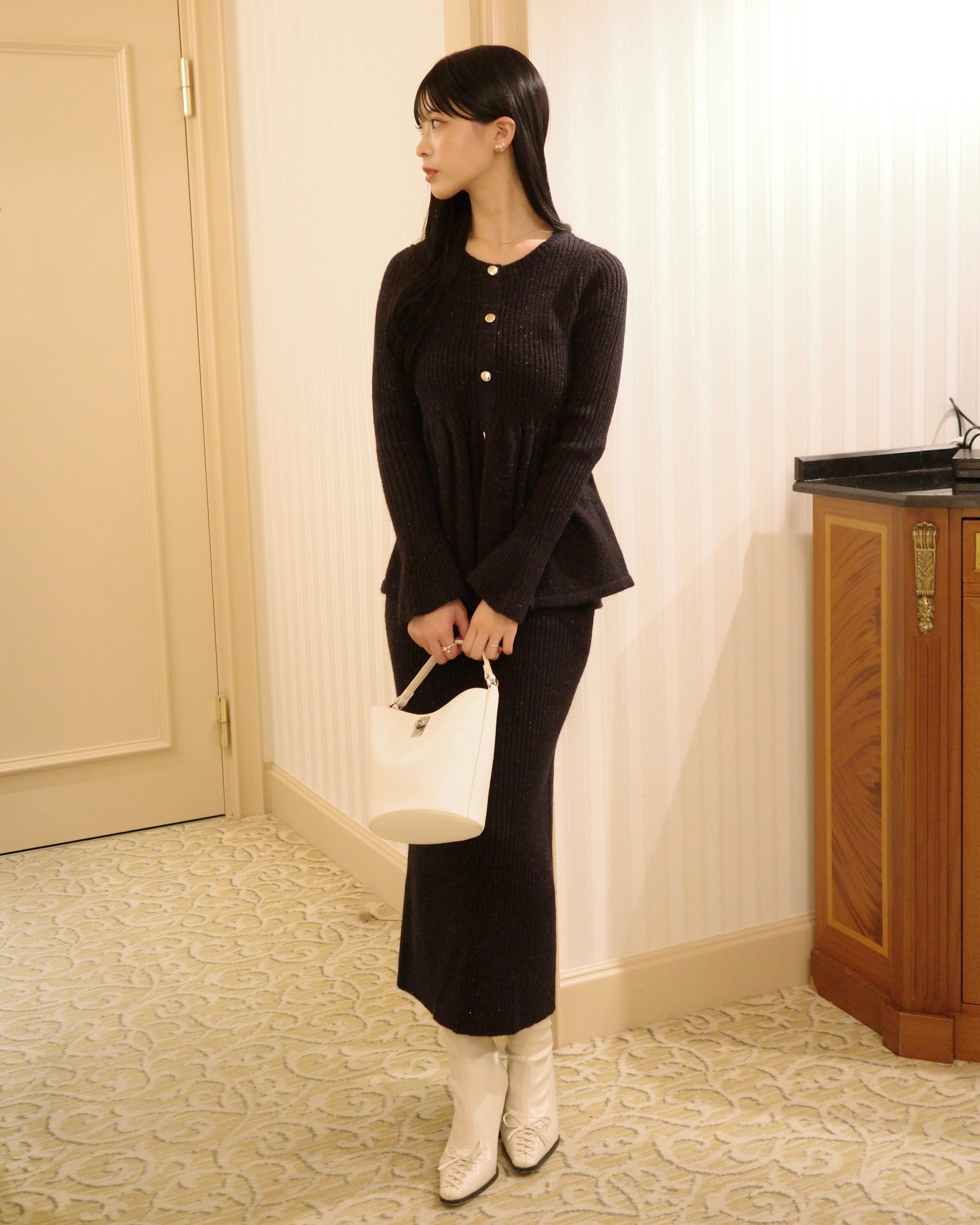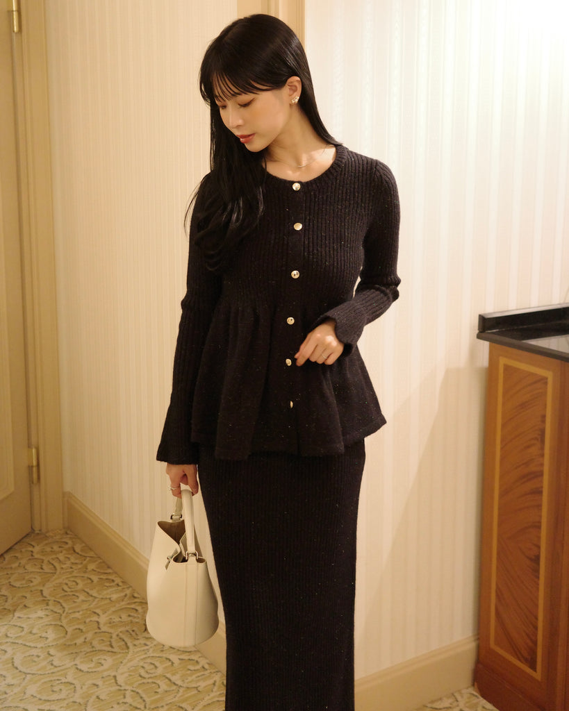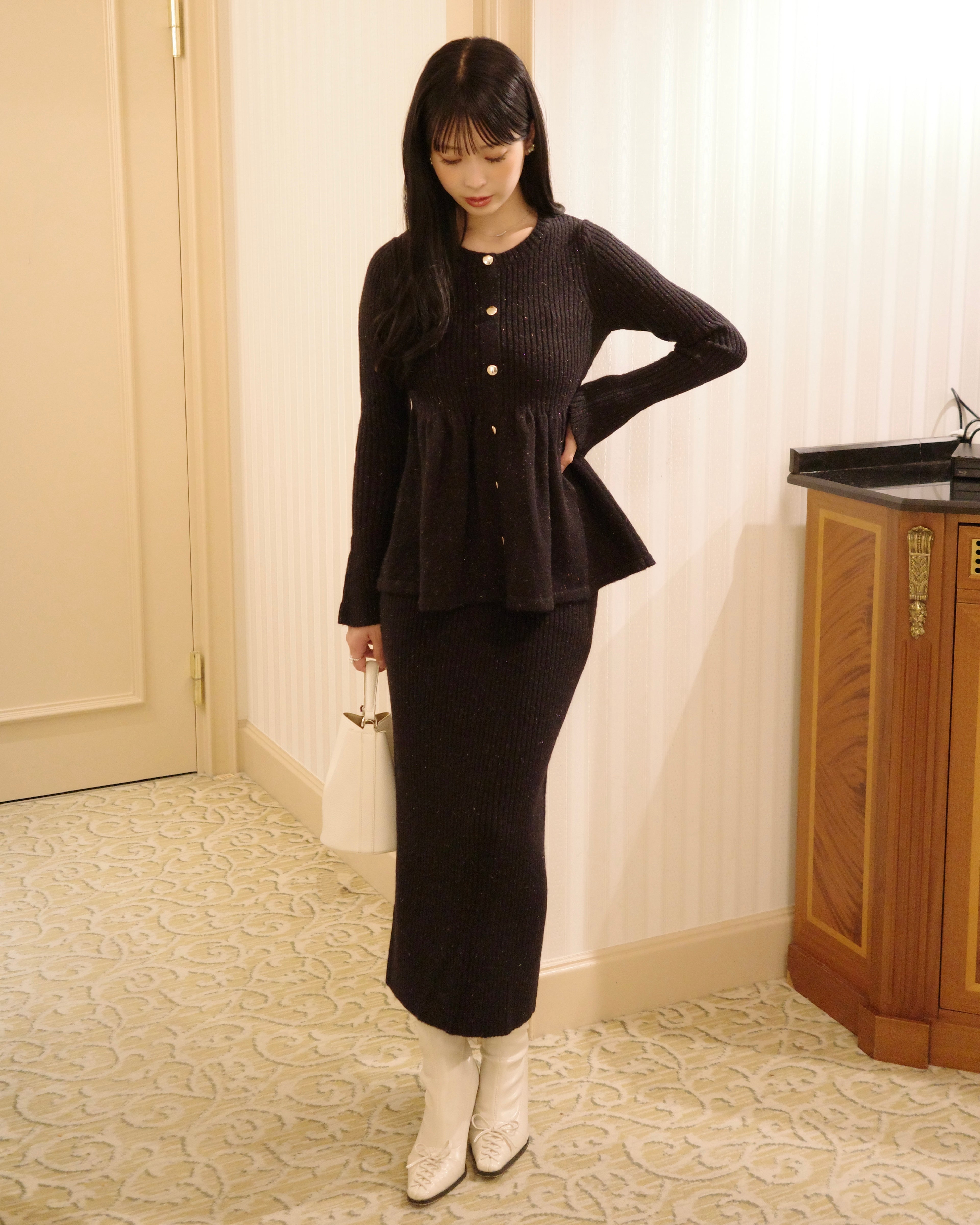 同素材のラメニットペプラムトップスとの組み合わせがおすすめです。