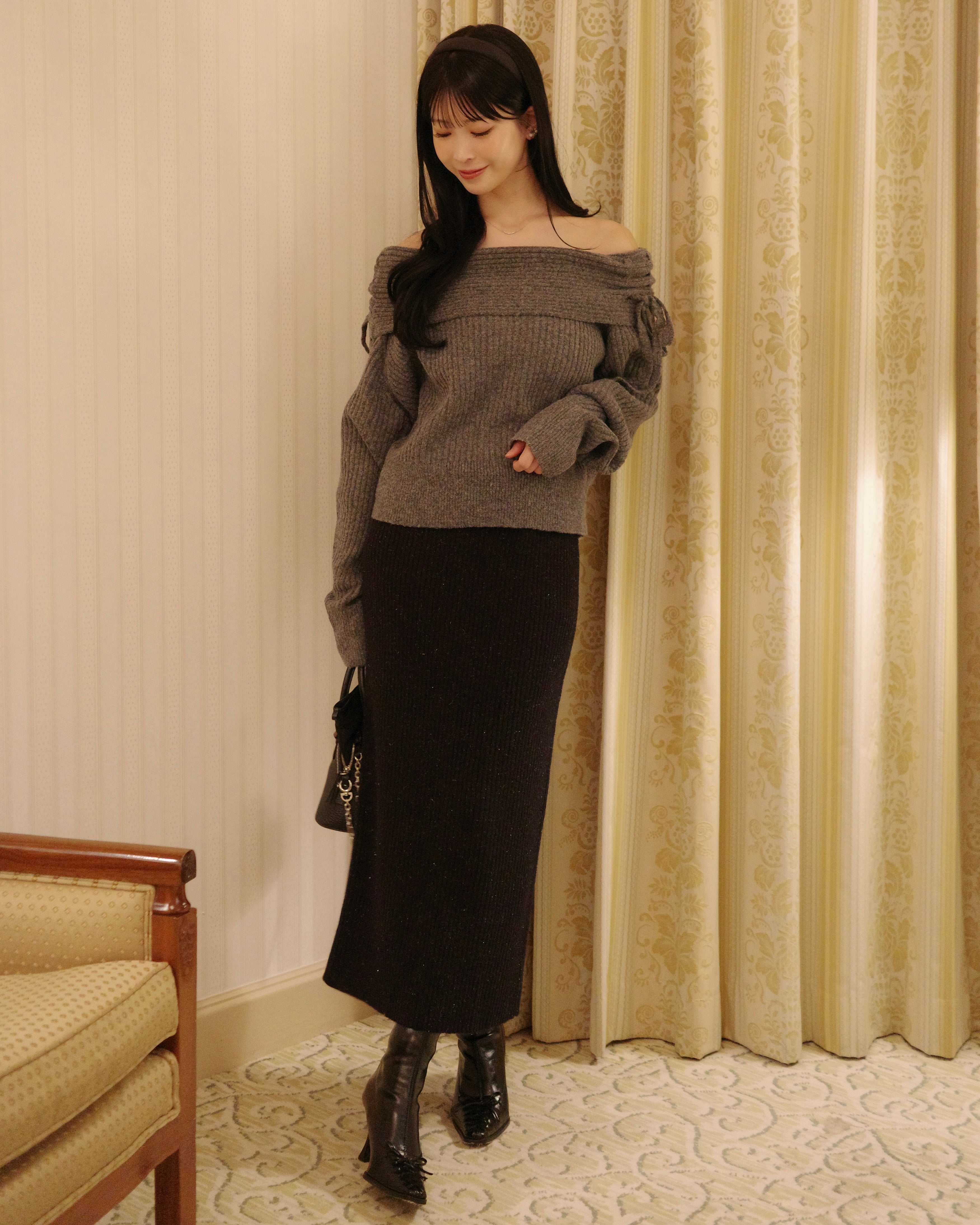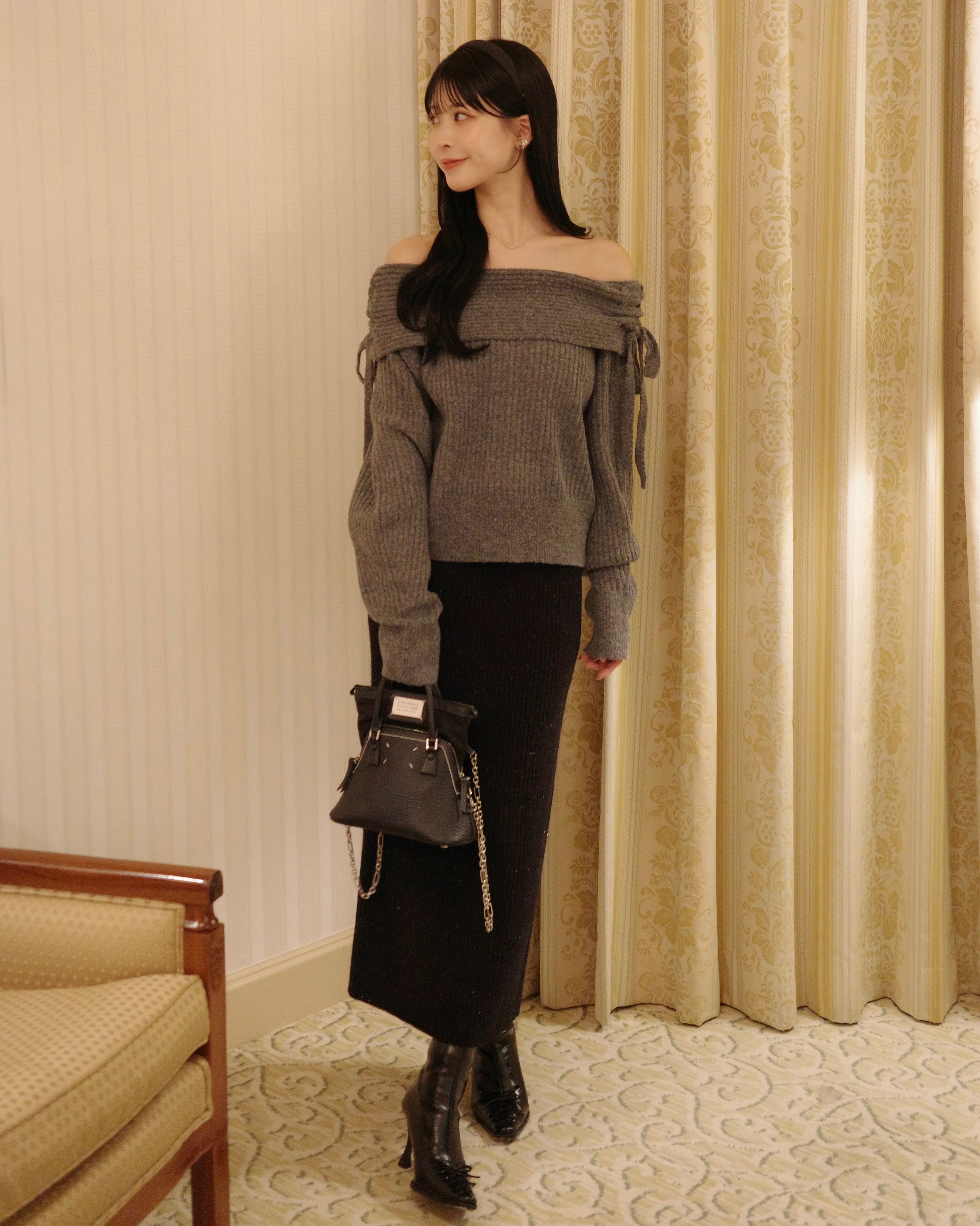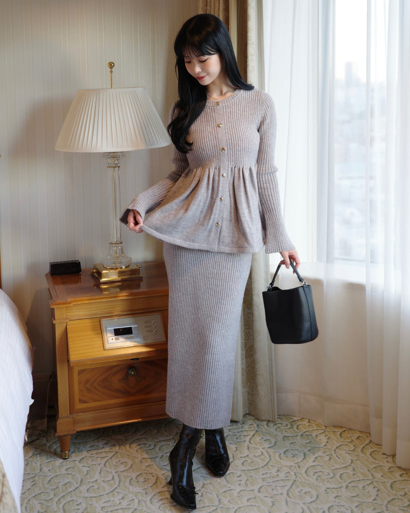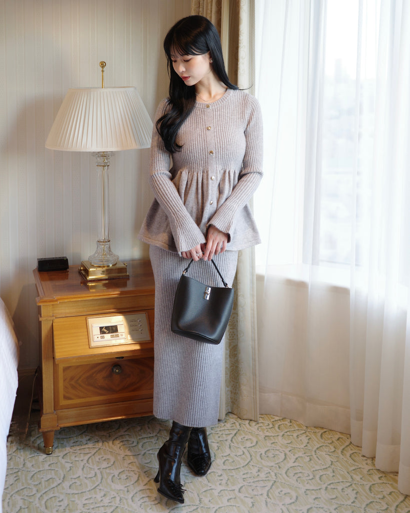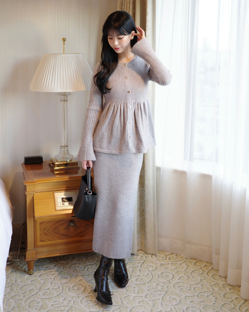 同素材のラメニットペプラムトップスとの組み合わせがおすすめです。