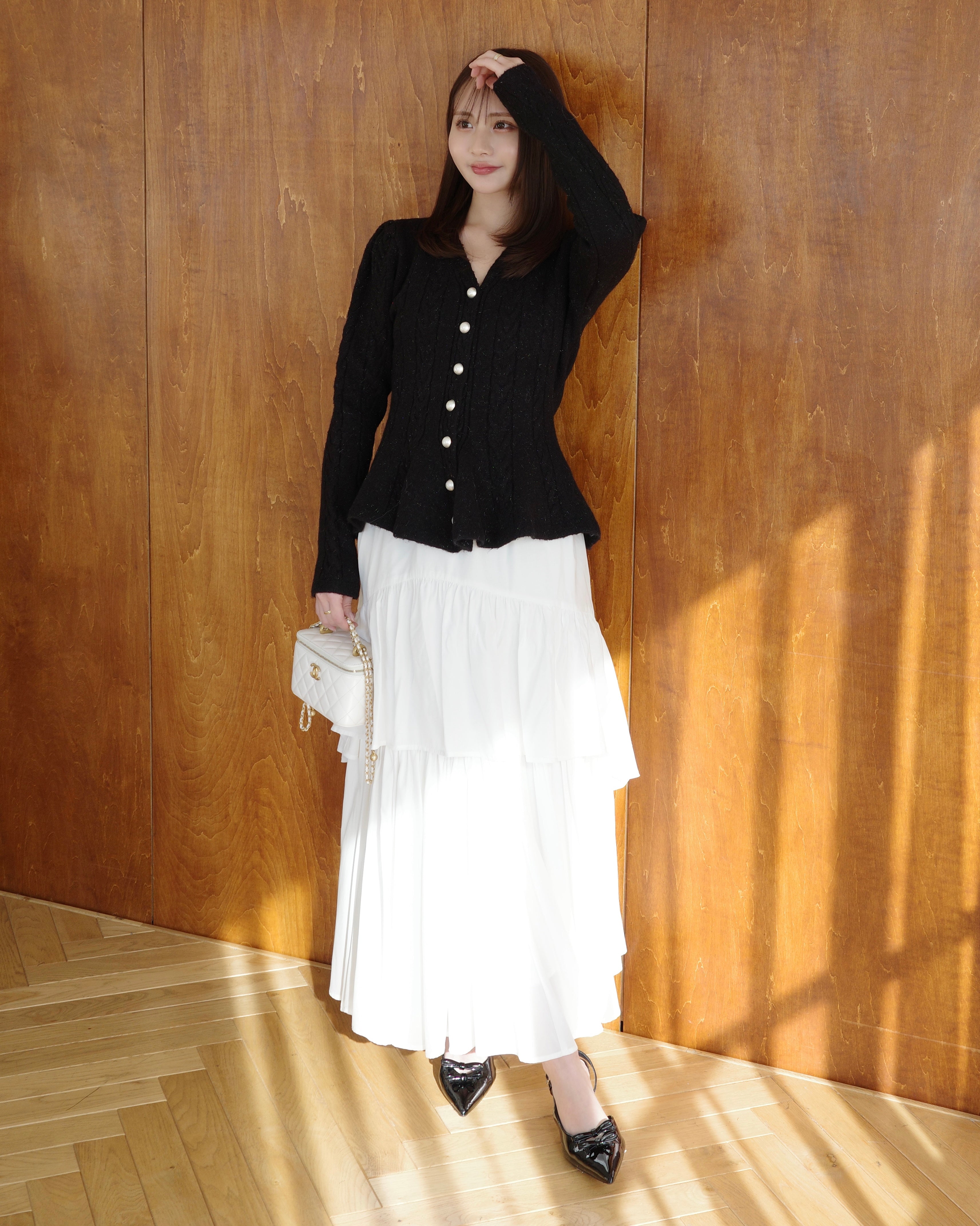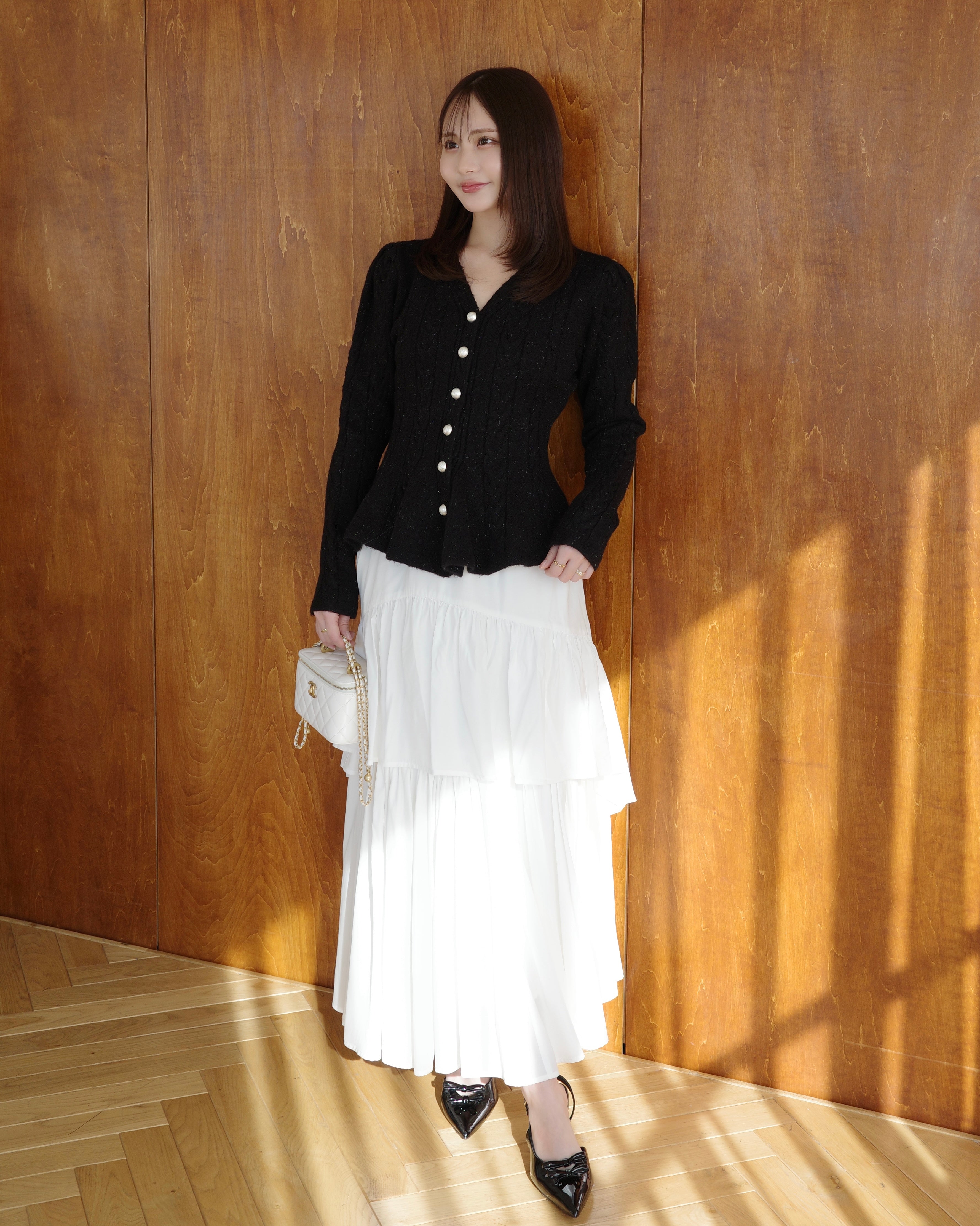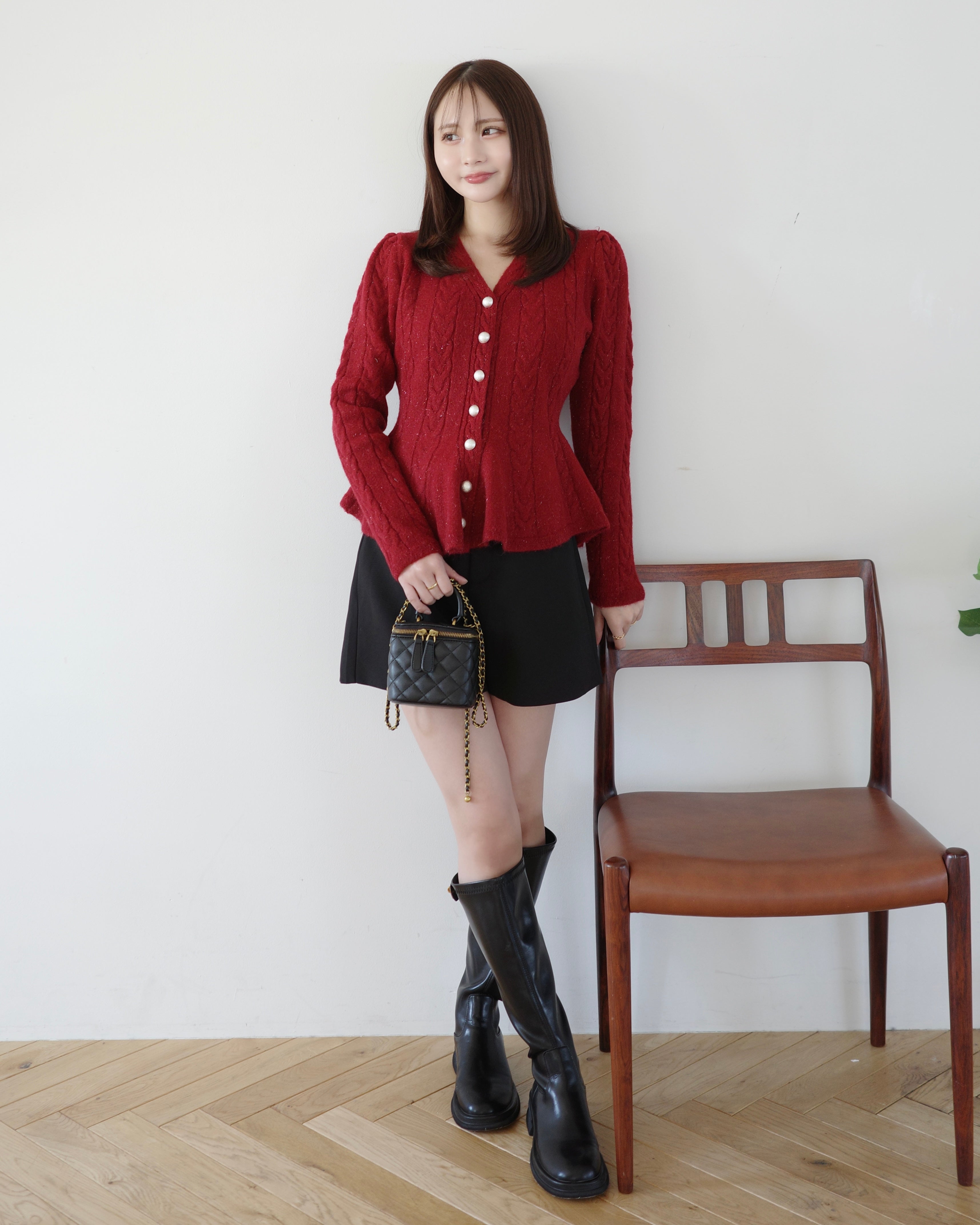 裾にかけて広がるペプラムシルエットは細見え効果抜群。